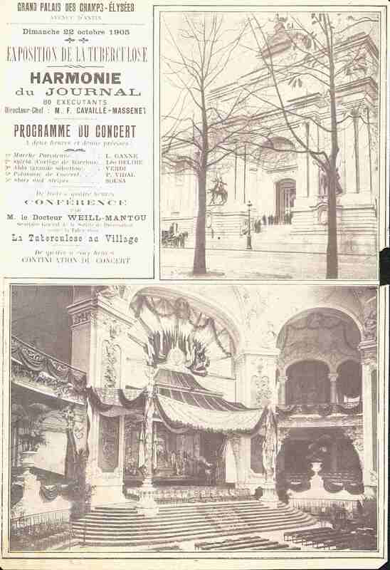 Exposition et conférence sur la Tuberculose au grand palais des Champs-Elysées sous le patronage d''un journal. Un concert est également donné en cette occasion.