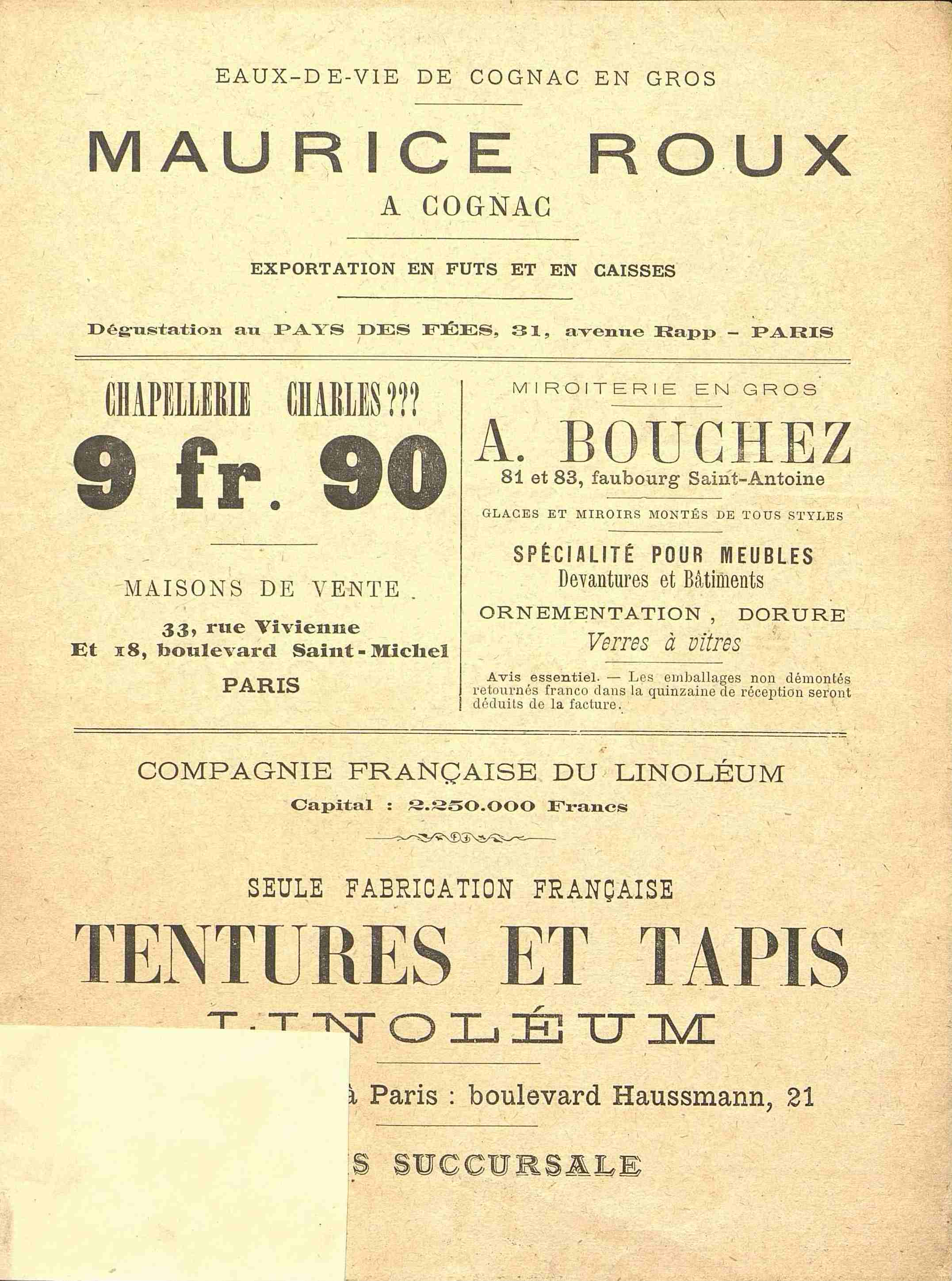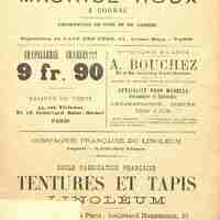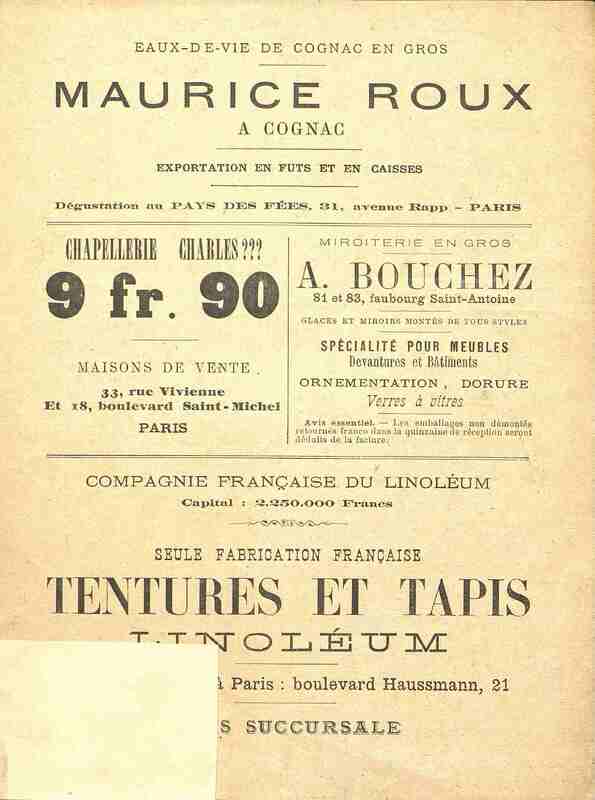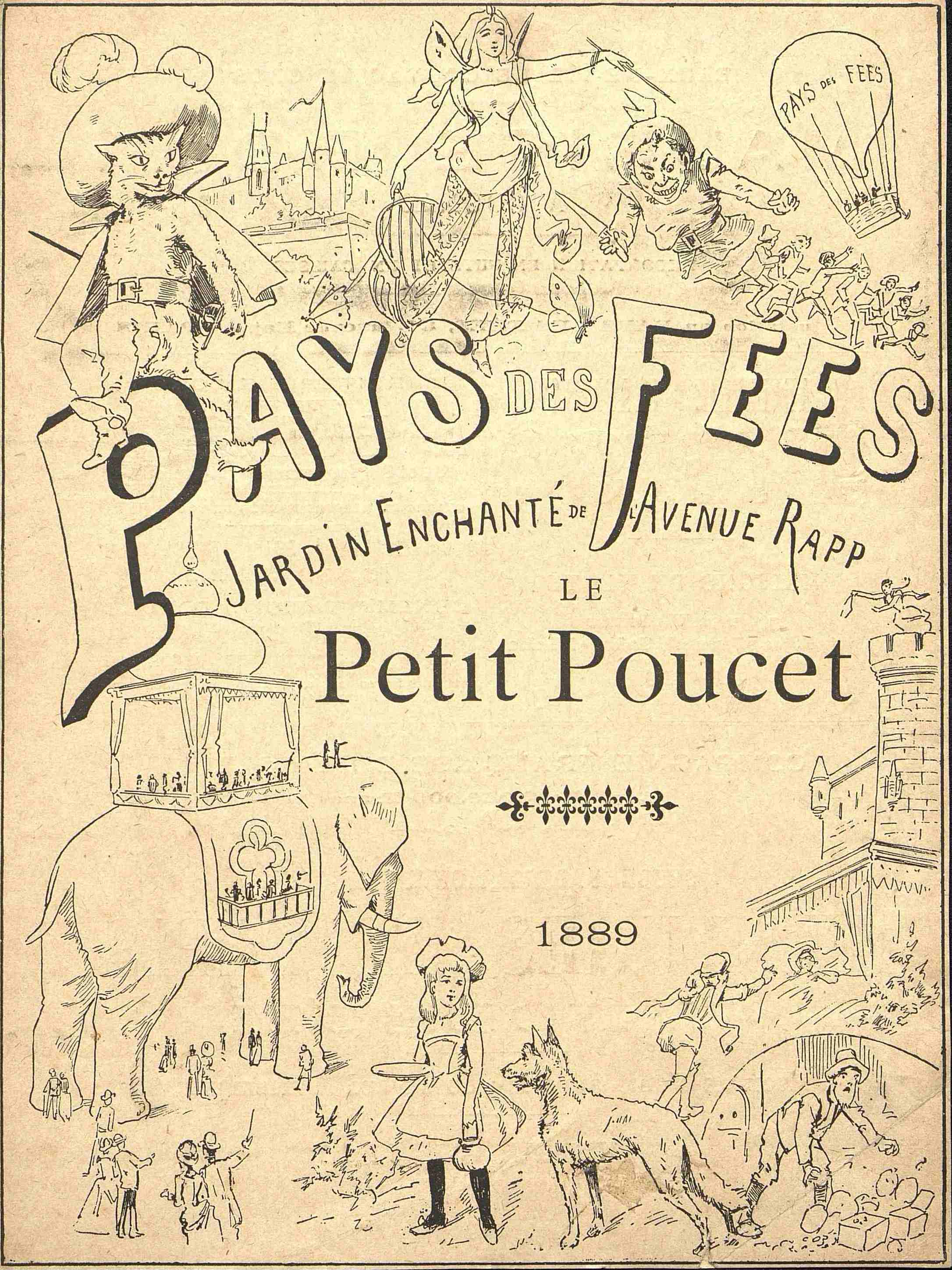 Publicité pour le Jardin Enchanté de l'Avenue Rapp à Paris, avec le Petit Poucet. Au dos d'autres publicités et un morceau de papier qui semble avoir été collé accidentellement.