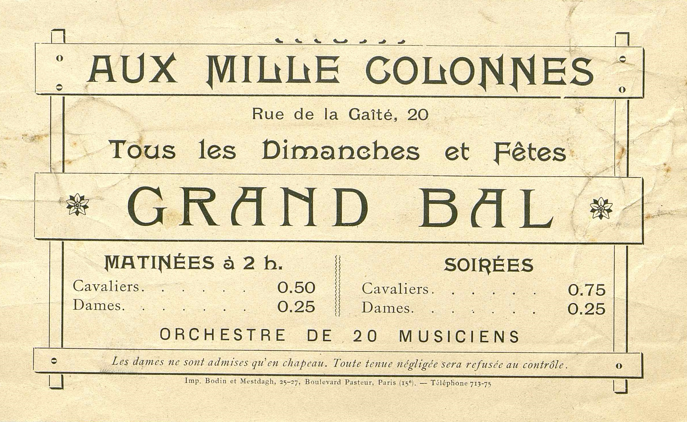 Feuille publicitaire pour la salle, Aux Mille Colonnes, établissement de bal, spectacles et restaurant. Les dames ne sont admises qu'en chapeau.