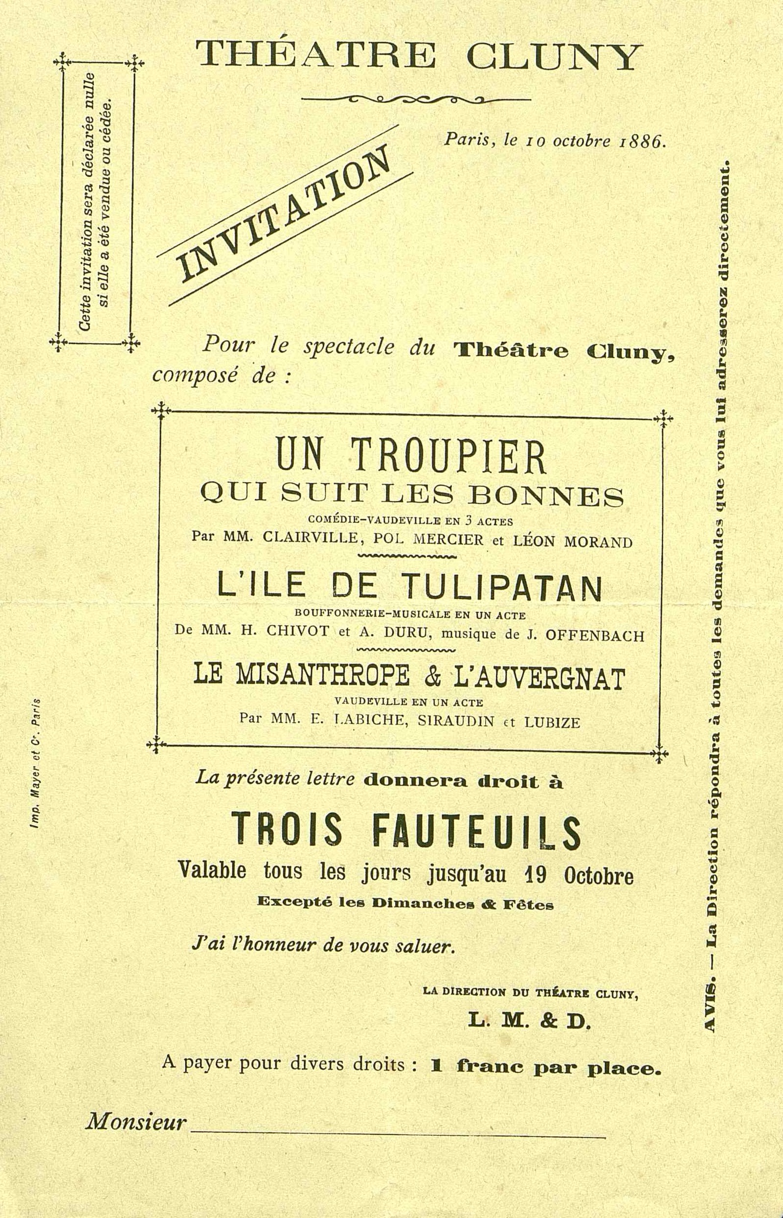 Théâtre de Cluny. Invitation