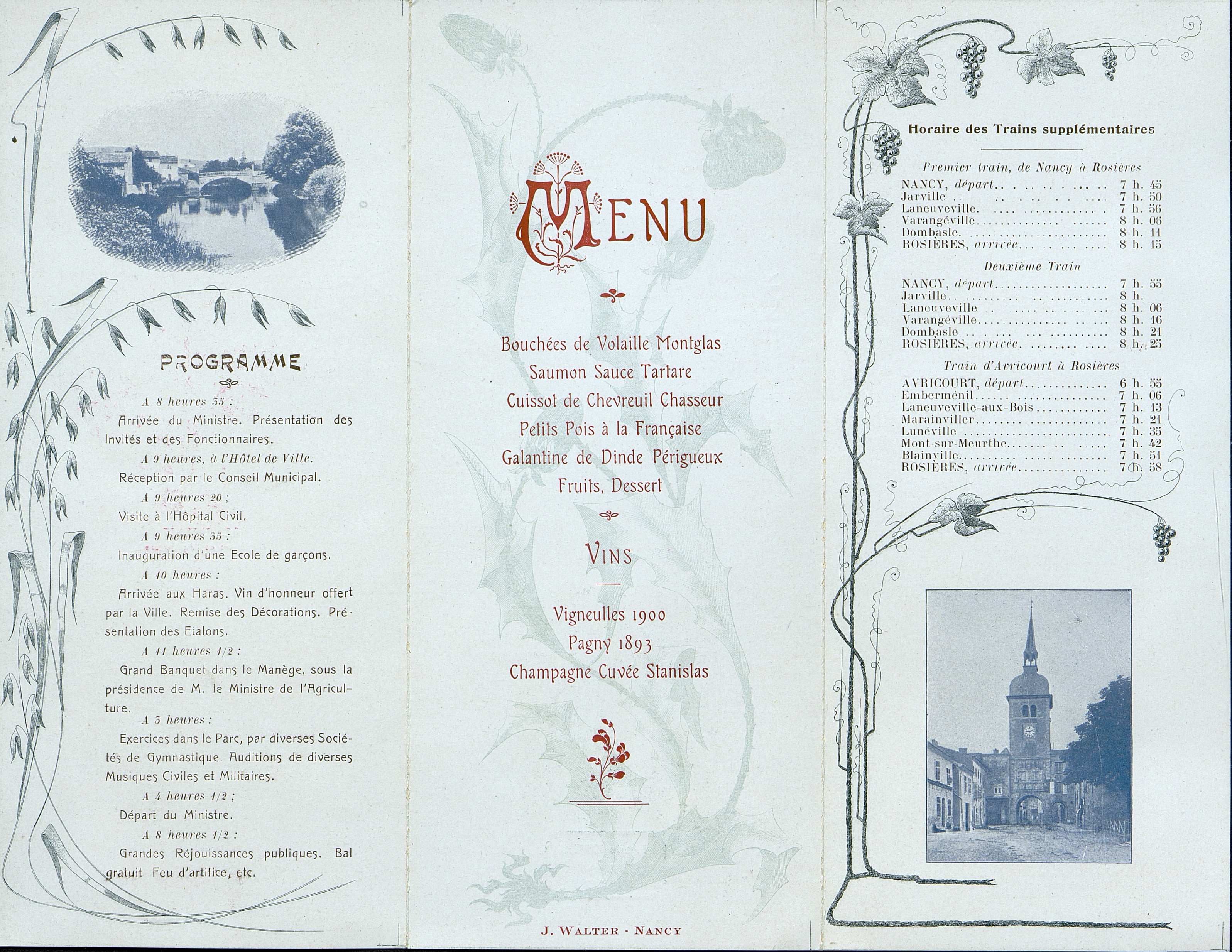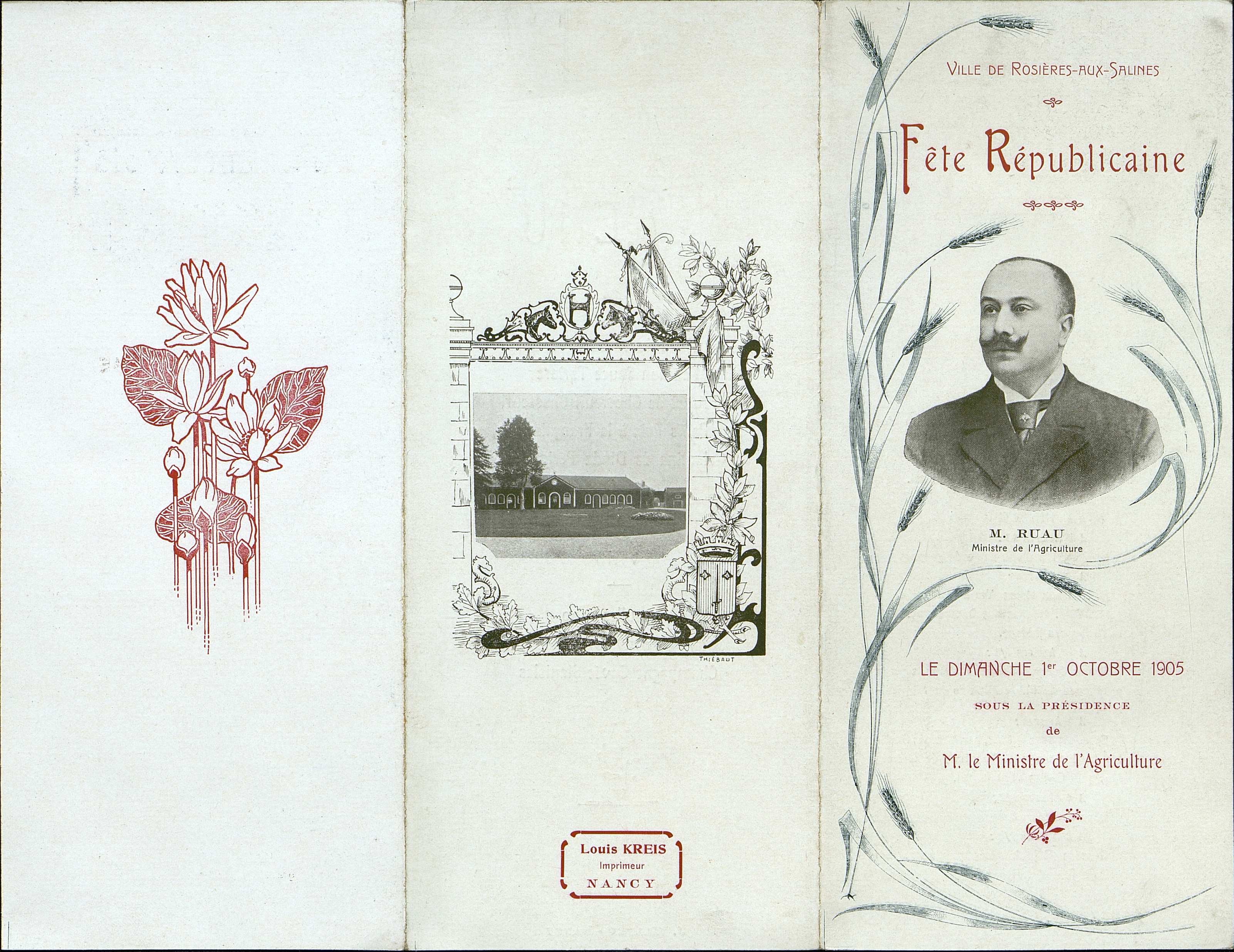 Menu en 3 volets. Fête Républicaine, sous la présidence du Ministre de l'agriculture M. Ruau. On y trouve le menu, le programme des festivités et les horaires des trains pour se rendre dans la ville de Rosières-aux-Salines de puis Nancy et Avricourt. Un portrait photographique du ministre en plus de vues du cette ville et des environs.