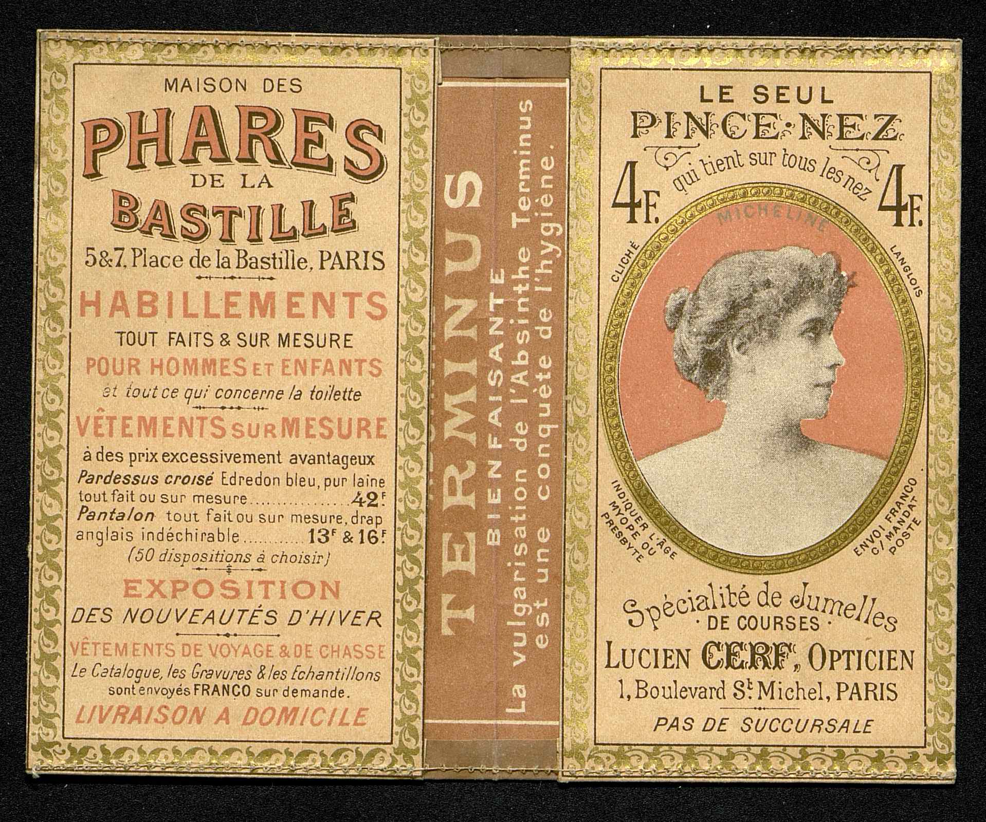 Au recto : Maison des Phares de la Bastille - 5 & 7 Place de la Bastille - Paris. Terminus ... la vulgarisation de l'absinthe...Le Seul pince-nez ...spécialiste des Jumelles de courses Julien Cerf Opticien - 1 Boulevard St-Michel - Paris. Illustration : portrait en médaillon de Micheline [probablement Micheline Kahn, harpiste et pianiste française (1889-1987 )].