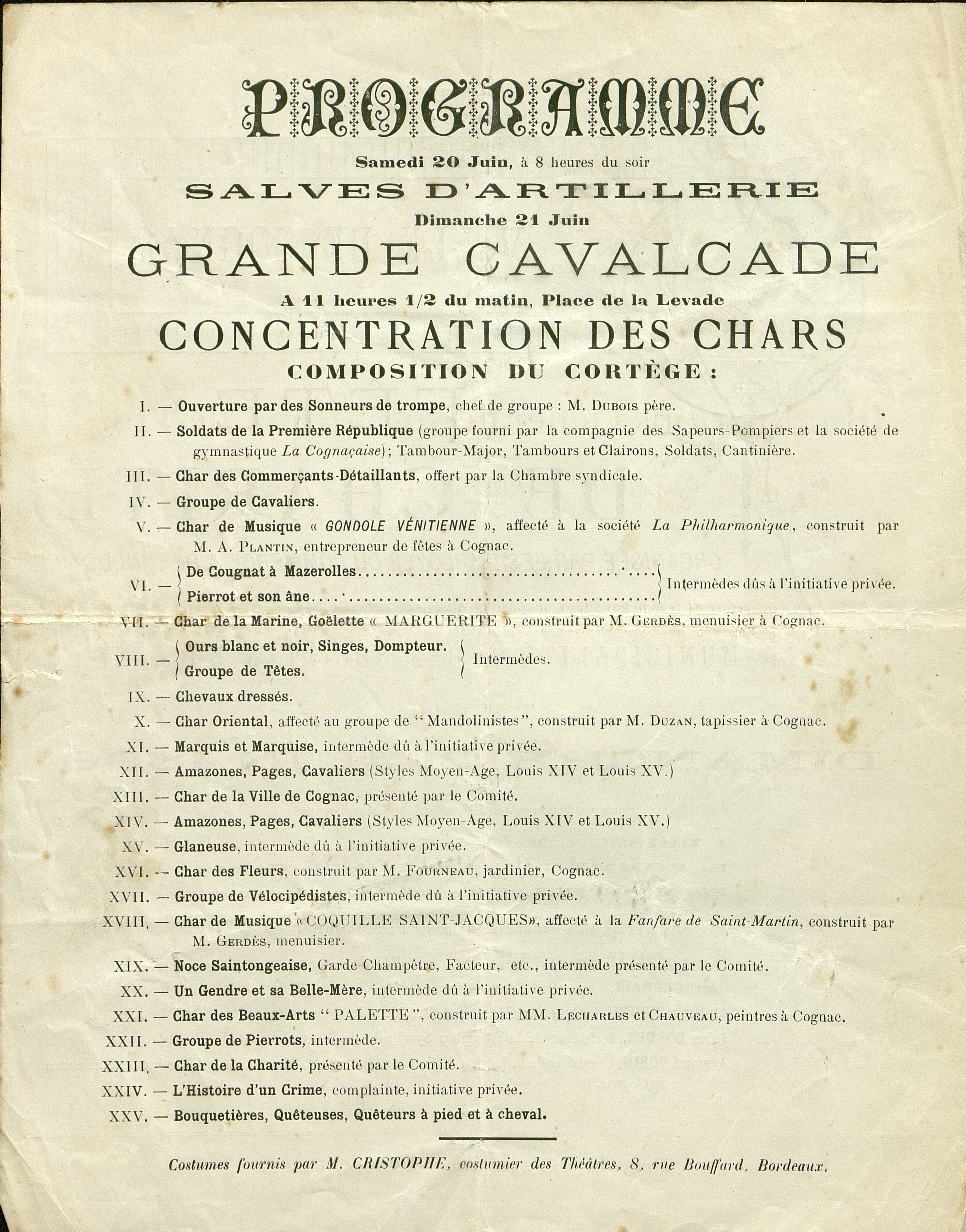 Programme : Salves d'artilleries. Grande cavalcade. Concentration de chars : composition du cortège. Bataille de fleurs. Fête de nuit. illuminations générales de l'Hôtel de Ville. Grand concert vocal et instrumental. bal par invitation.