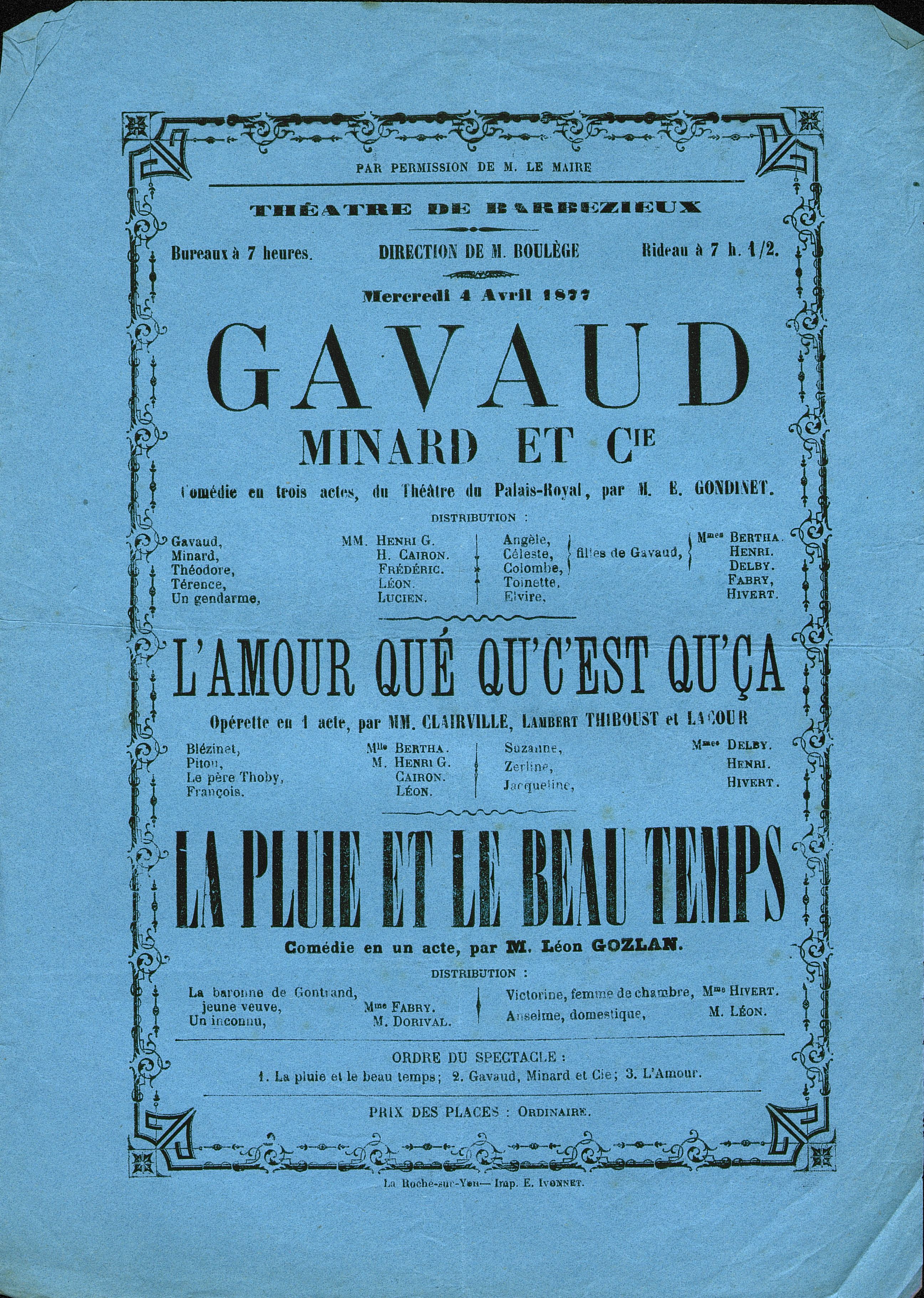 Programme : "Gavaud Minard et Cie" : comédie en trois actes, du Théâtre du Palais-Royal de Gondinet . "L' Amour qué qu'c'est qu'ça" : opérette de Clairville, Lambert Thiboust et Lacour. "La Pluie et le beau temps" de Léon Gozlan.