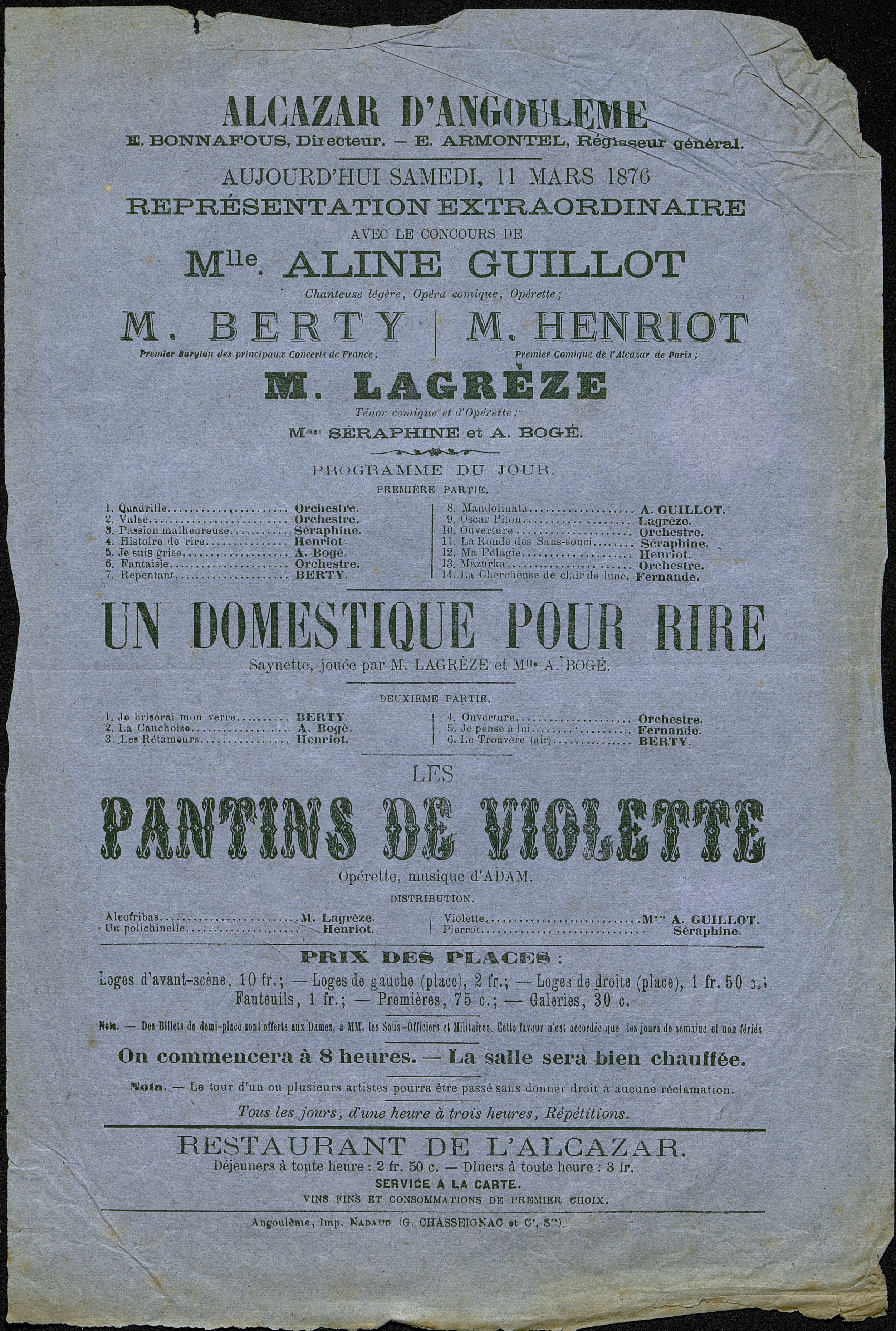 Programme : Première partie : œuvres musicales. Un domestique pour rire : saynète /Lagrèze, A. Bogé. deuxième partie : oeuvres musicales. Les Pantins de Violette , opérette / Adam, comp. ; Lagrèze, Henriot, Guillot, chant.