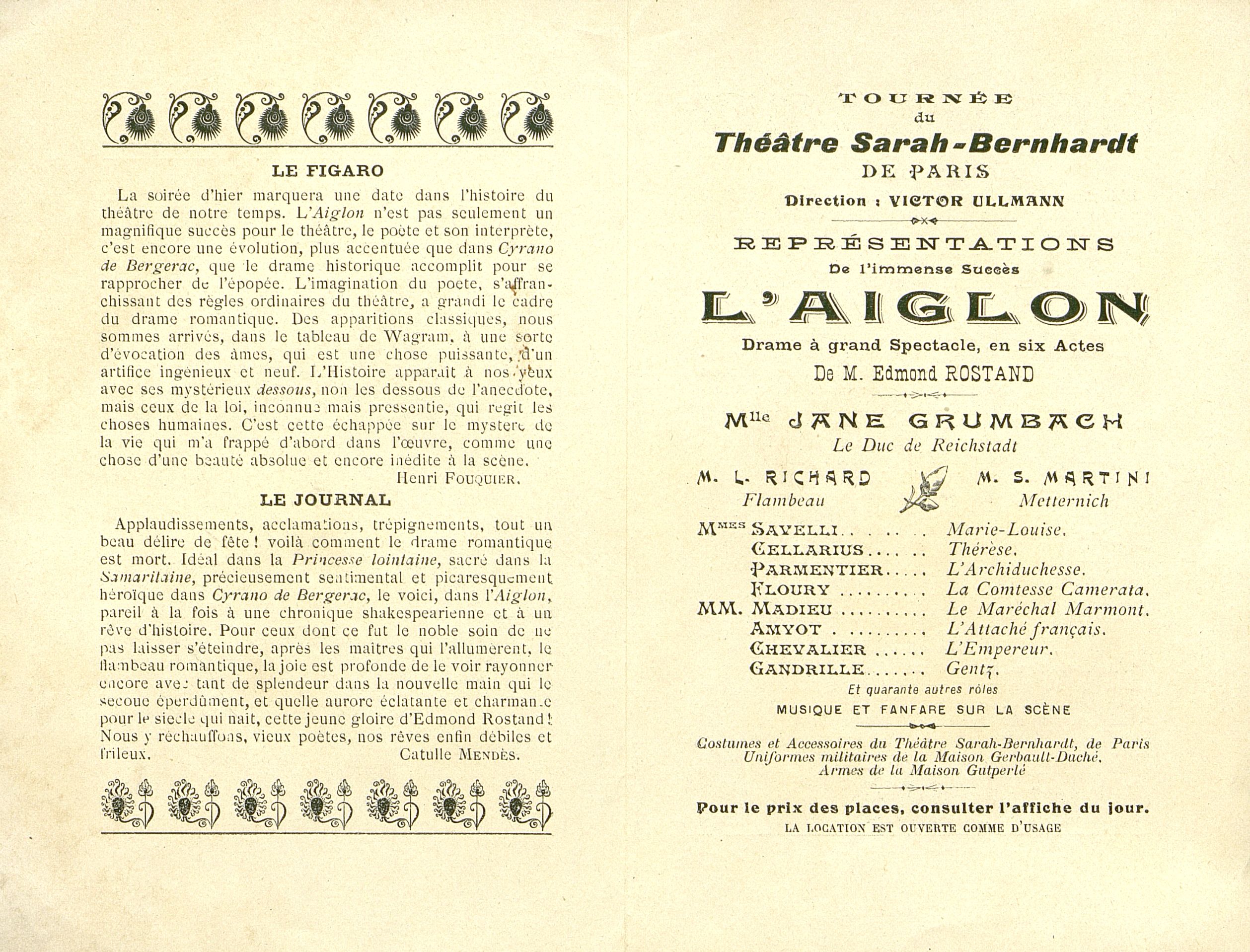 Représentation de l'immense succès L' Aiglon