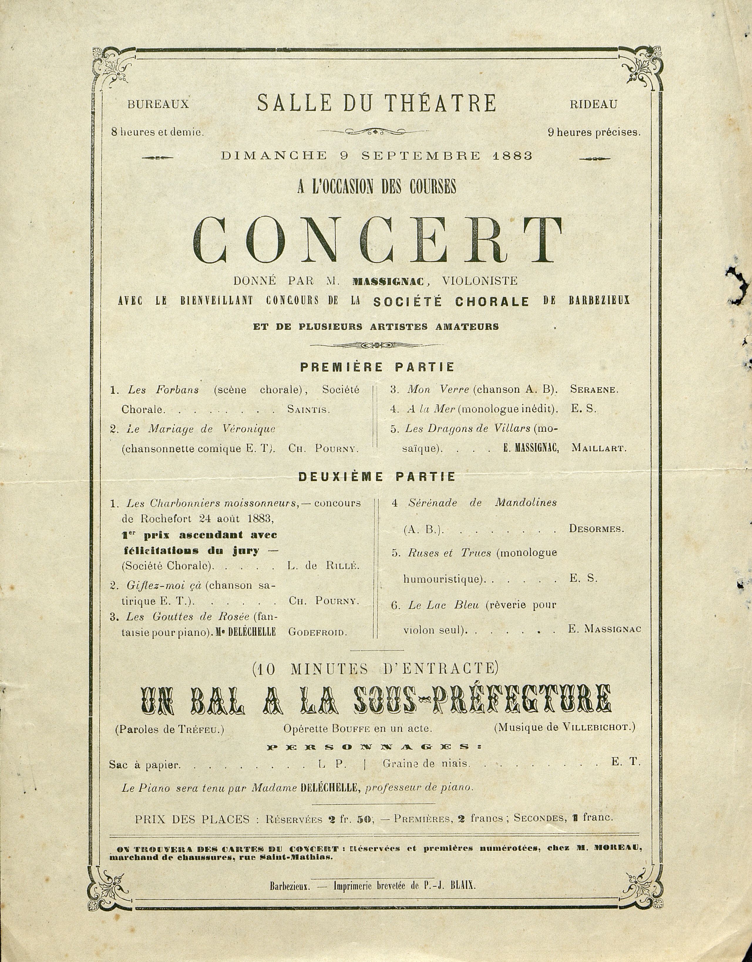 Programme du concert : Les Forbans : scène chorale / Saintis. Le Mariage de Véronique / Charles Pourny. Mon Verre / Seraene. A la Mer : monologue inédit. Les Dragons de Villars : mosaïque / Maillart, Adapt. Massignac, vl. Les Charbonniers moissonneurs : concours de Rochefort 24 Août 1883. / L. De Rillé. Giflez-moi ça / Ch. Pourny. Les Gouttes de Rosée : fantaisie pour piano / Godefroid ; Me Deléchelle, p. Sérénade de Mandolines / Desomes . Ruses et Trucs : monologue humoristique / E.S. Le Lac bleu : rêverie pour violon seul / E. Massignac. Un bal à la Sous-préfecture : Opérette Bouffe en un acte / Tréfeu, paroles ; Villebichot, Mus.
