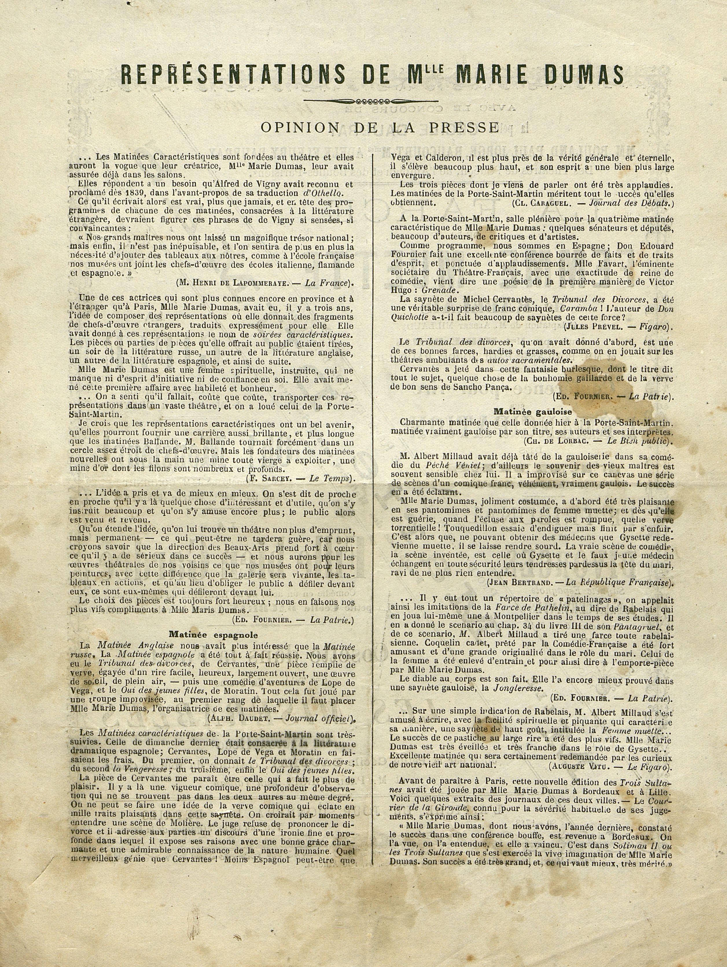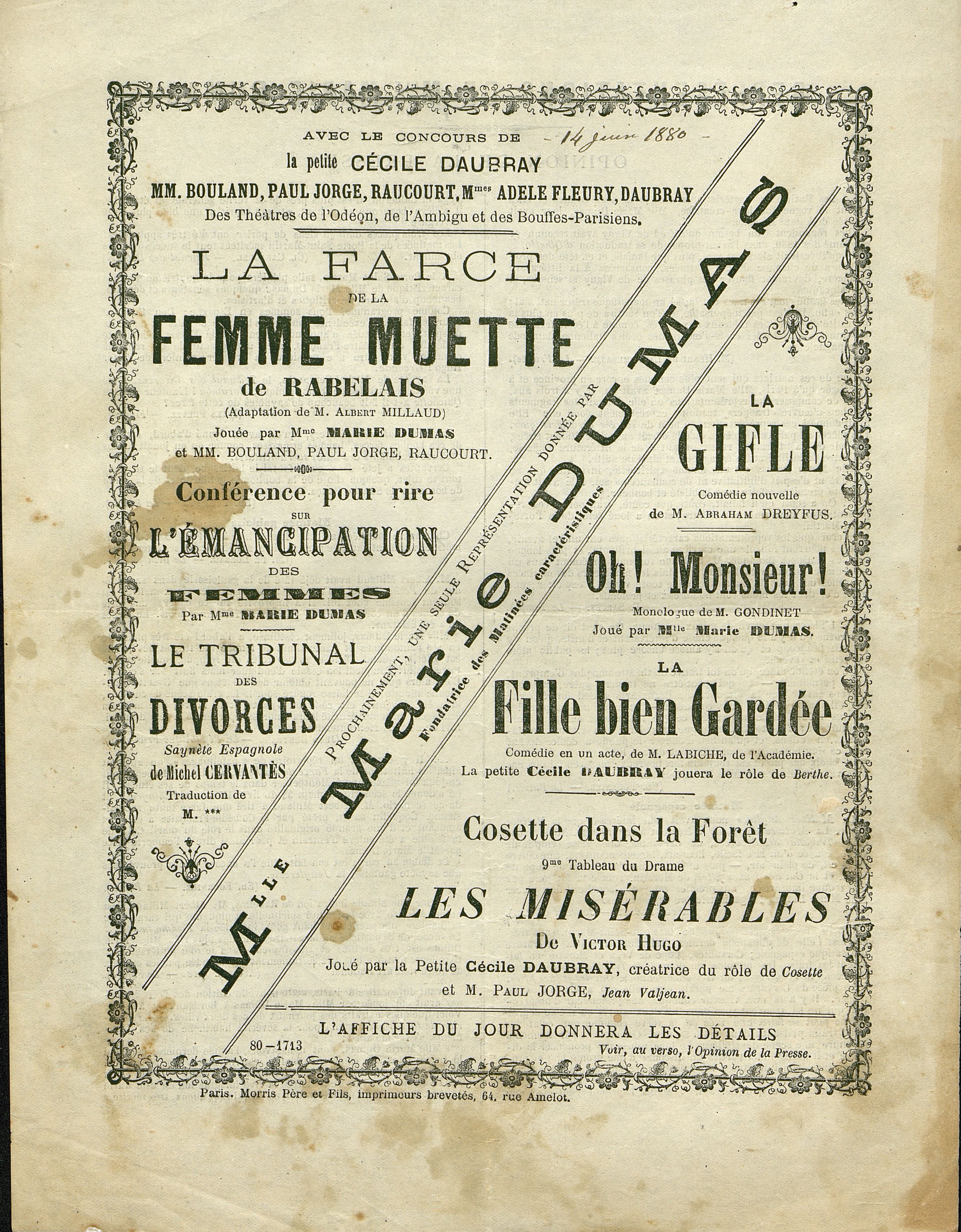 Programme : Conférence pour rire sur l'émancipation des femmes. Tribunal des divorces, saynète espagnole de Michel de Cervantès. La Gifle comédie nouvelle de M Abraham Dreyfus. Oh ! Monsieur, Monologue de M Gondinet. La Fille bien gardée, comédie en un acte de M Labiche. Cosette dans la forêt 9ème tableau des Misérables de M Victor Hugo. Les Misérables . au verso : Représentation de Mlle Marie Dubois: opinion de la presse.