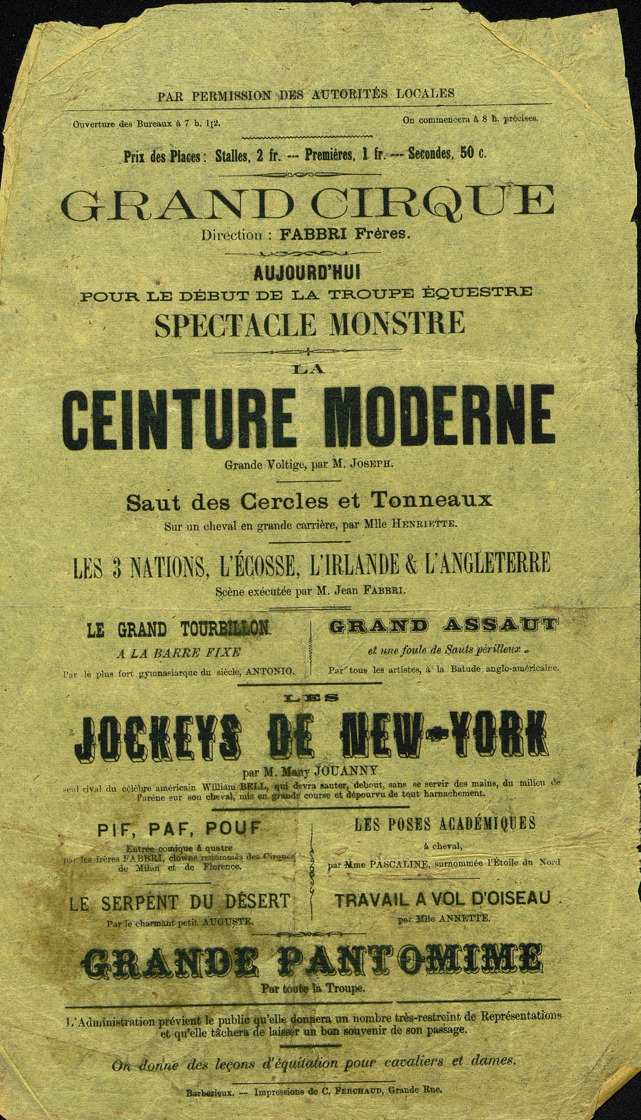 Programme : La ceinture moderne : grande voltige / M . Joseph. Saut des Cercles et Tonneaux / Mlle Henriette. Les 3 Nations : L' Écosse, L' Irlande et L' Angleterre/ M. Jean Fabri. Le Grand Tourbillon à la barre fixe / Antonio. Grand Assaut et une foule de sauts périlleux . Les Jockeys de New-York / Many Jouanny . Pif, Paf, Pouf / Frères Fabri. Le serpent du désert / Auguste. Les poses académiques / Pascaline. Travail à vol d'oiseau / Annette. Grande Pantomime. Leçons d'équitation pour cavaliers et dames.