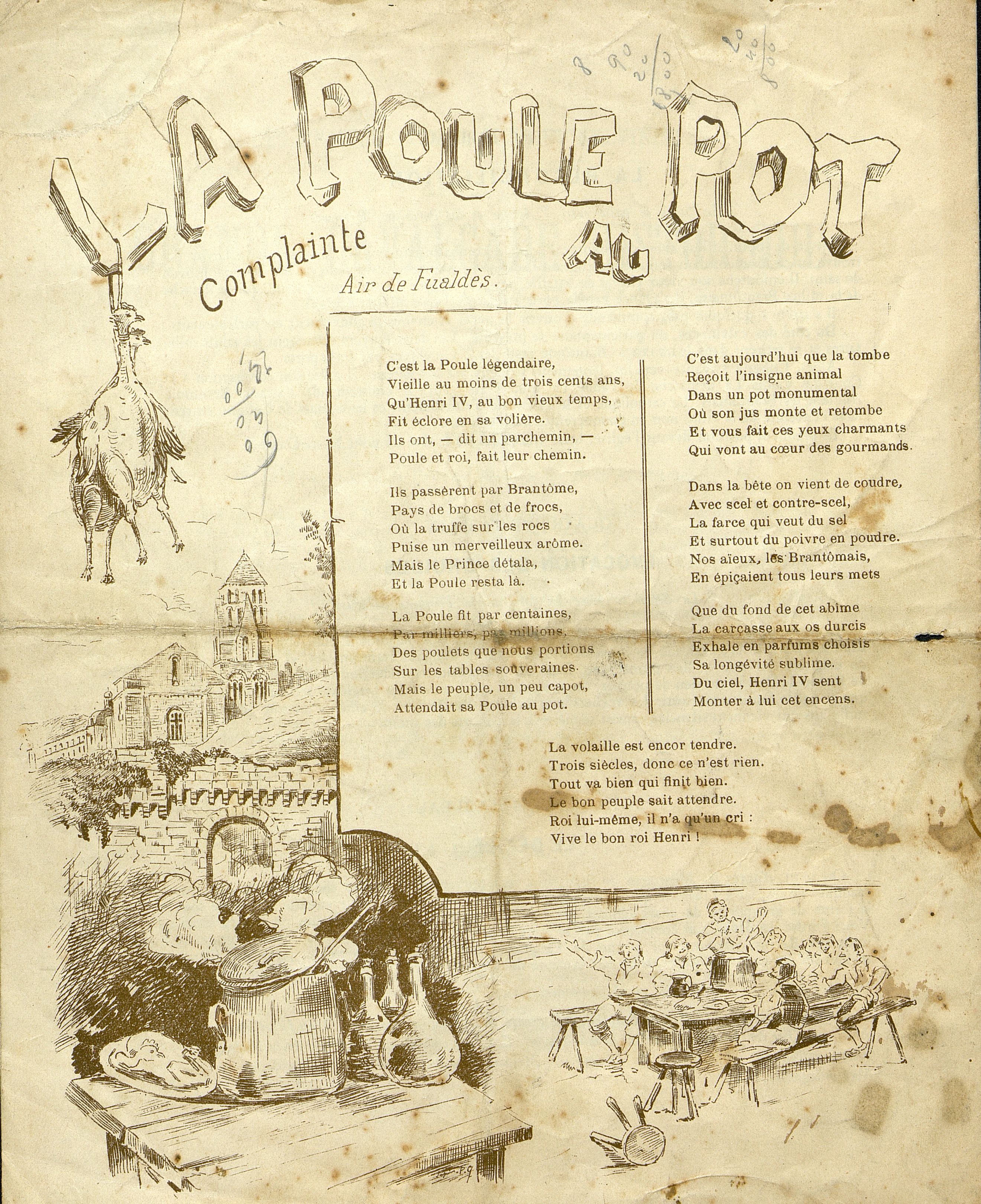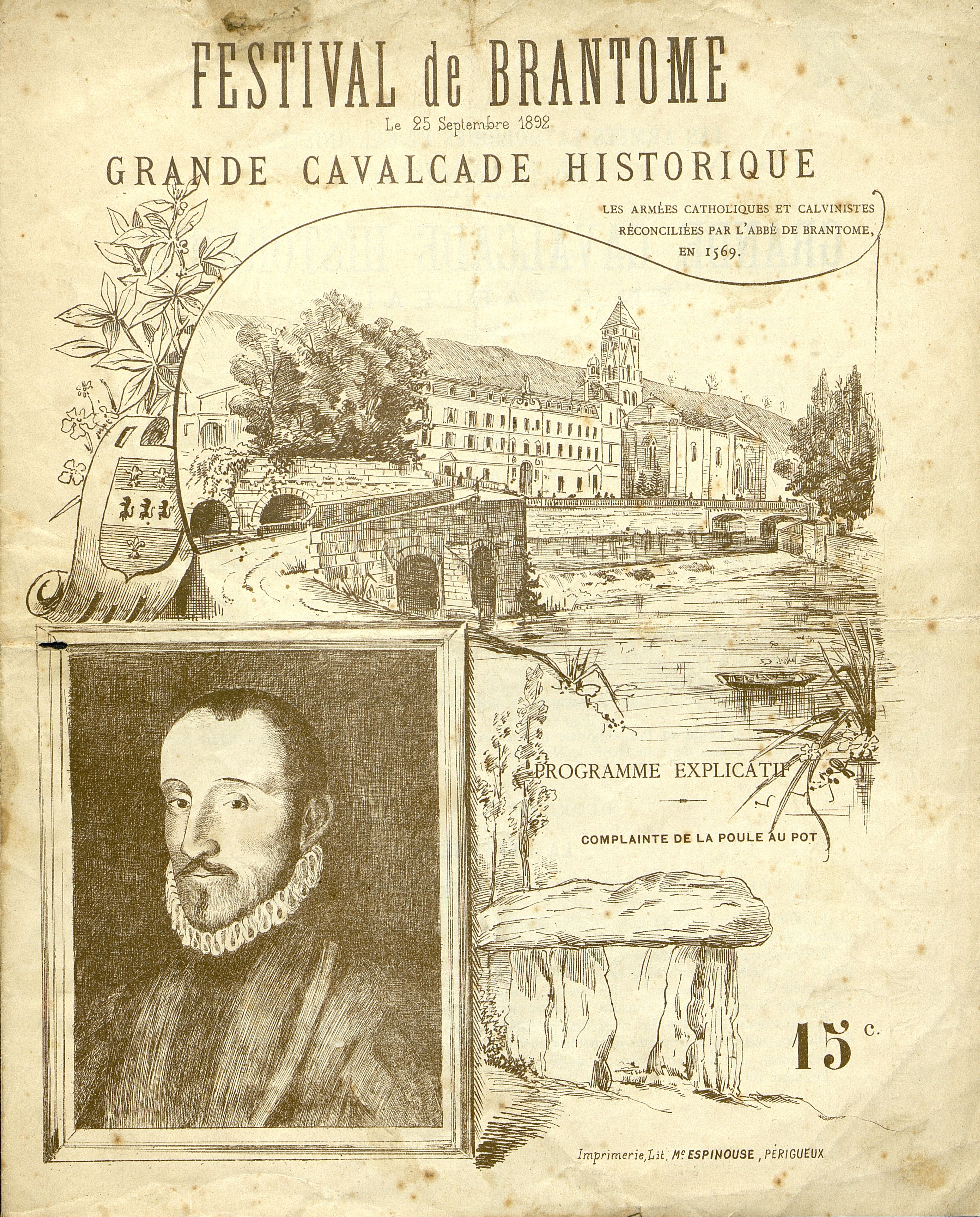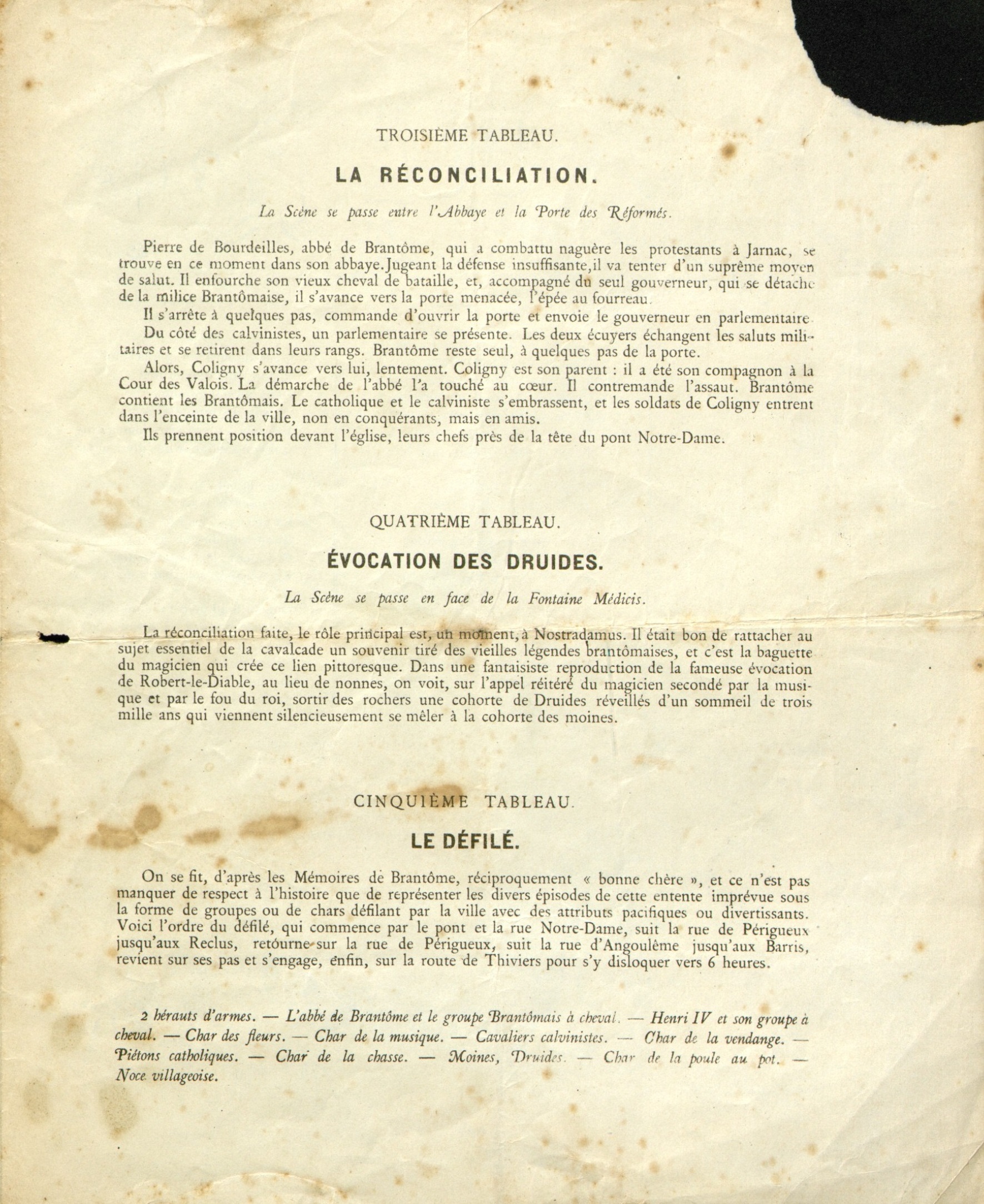 Programme : Premier tableau : L' attaque : La scène entre le Pont des Barris et la Porte des Réformés. Deuxième tableau : La défense. Les armées catholiques et calvinistes réconciliées par l'abbé de Brantôme en 1569. Troisième tableau : la réconciliation . Quatrième tableau : Évocation des druides. Cinquième tableau : Le Défilé. Chanson La Poule au Pot : complainte sur un Air de Fualdès.