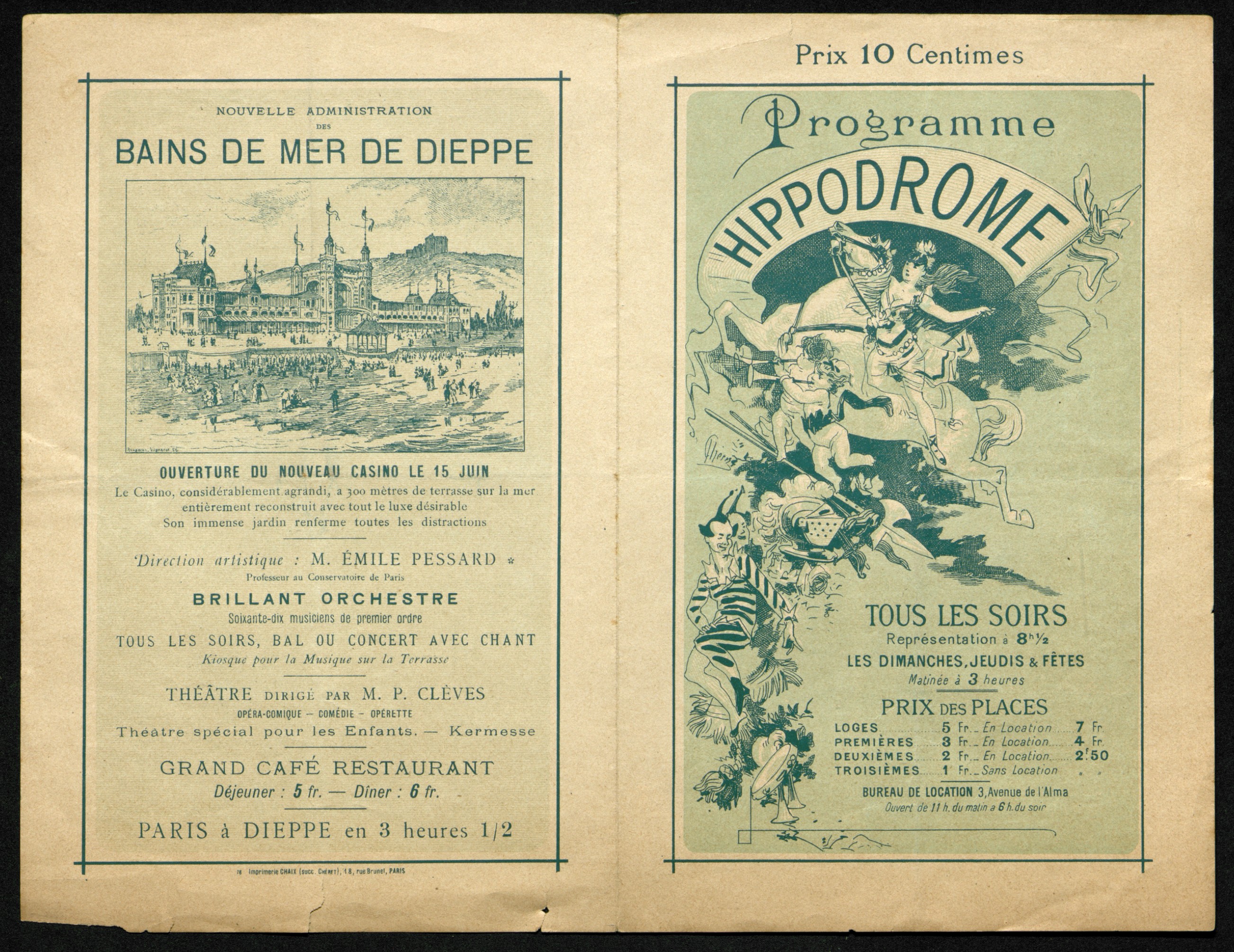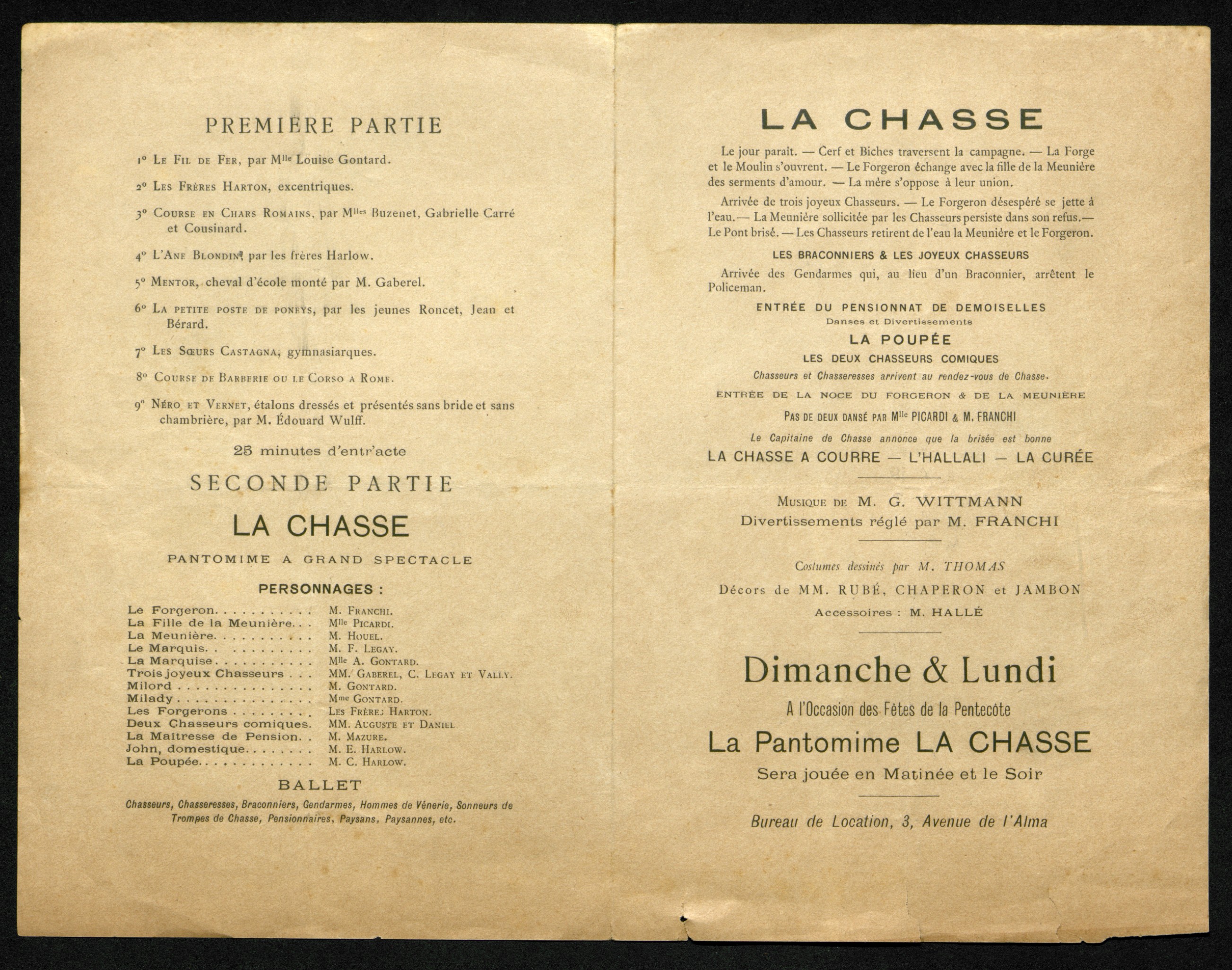 Programme : première partie : Le Fils de Fer par Mlle Louise gontard. Les Frères Harton. Courses de chars romains. L'âne Blondin par les frères Harlow. Mentor , cheval d'école. La Petite poste de poneys. Les Soeurs Castagna. Course de Barberie ou le corso à Rome. Néro et Vernet. Seconde partie : La Chasse, pantomime à grand spectacle.