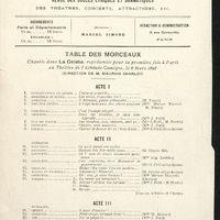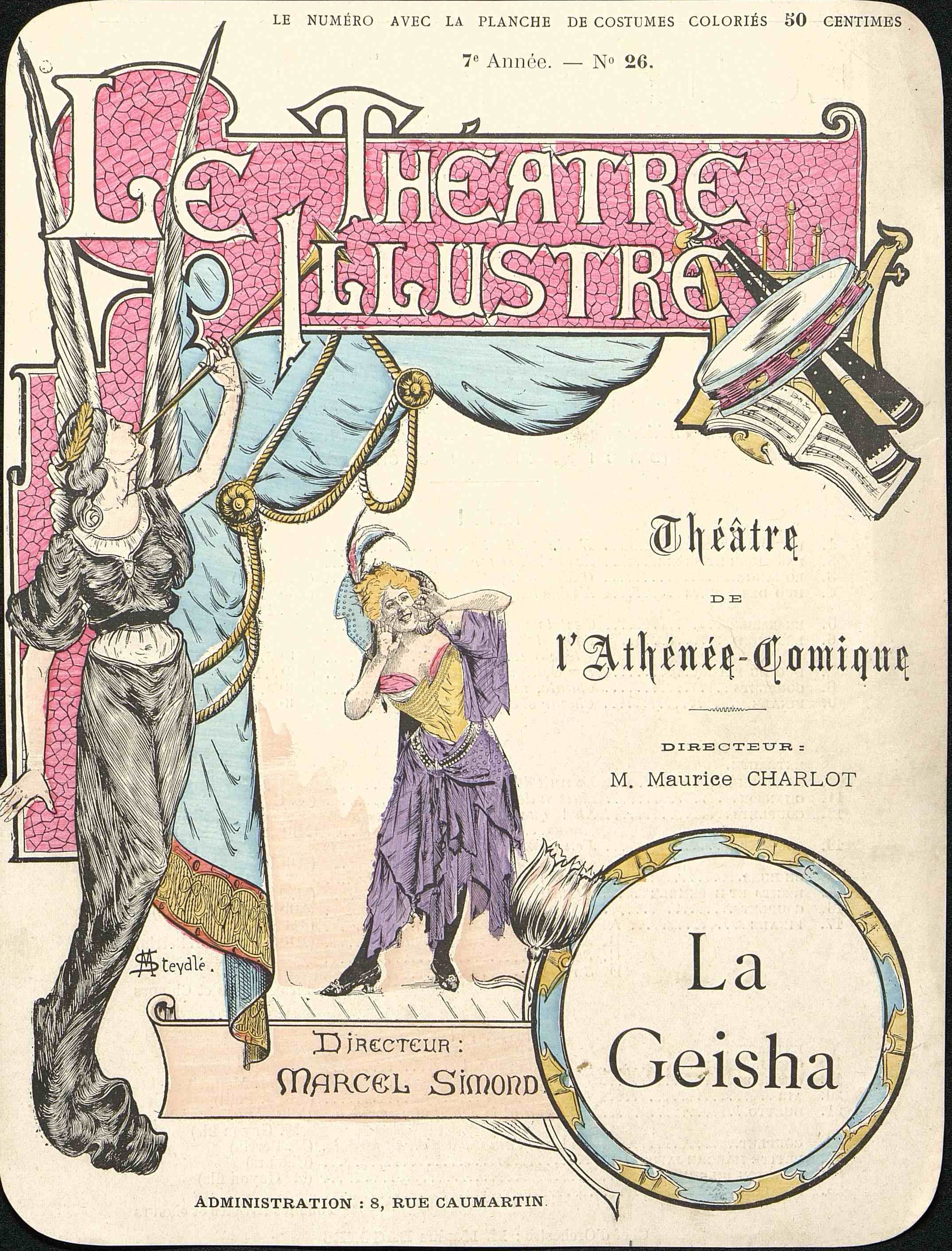 La Geisha, page publicitaire pour le Théâtre de l'Athénée-comique, découpée dans le magazine Le Théâtre Illustré. Au dos, la distribution de cette pièce.