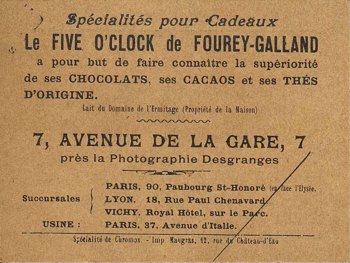Publicité pour Le Five o'clock de Fourey-Galland, 7 avenue de la Gare à Paris. Magasin spécialisé en chocolats, thés et cafés. Lait du Domaine de l'Ermitage.