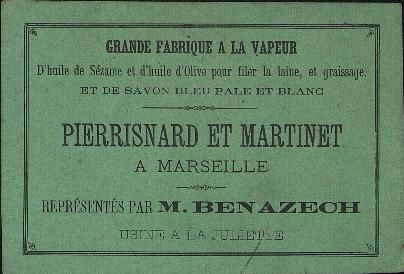 - Publicité pour une usine sis à la Juliette à Marseille assurant la fabrication d'huiles diverses pour la consommation ou d'autres usages.