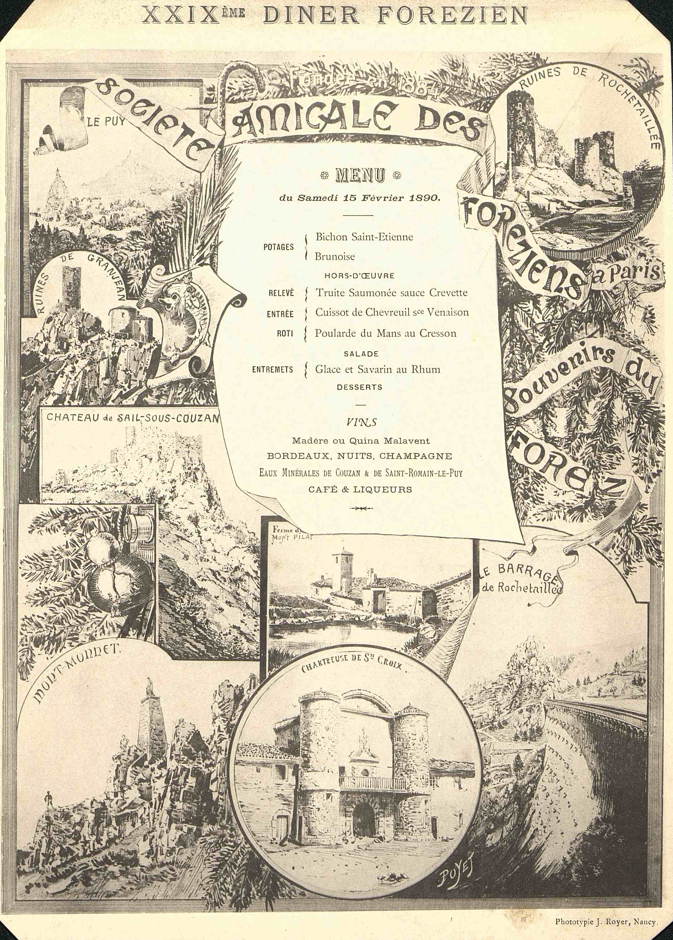 Vins : Madère ou Quina Malavent ; Bordeaux ; Nuits ; Champagne ; Eaux minérales de Couzan et de Saint-Romain-le-Puy. Café et Liqueurs.