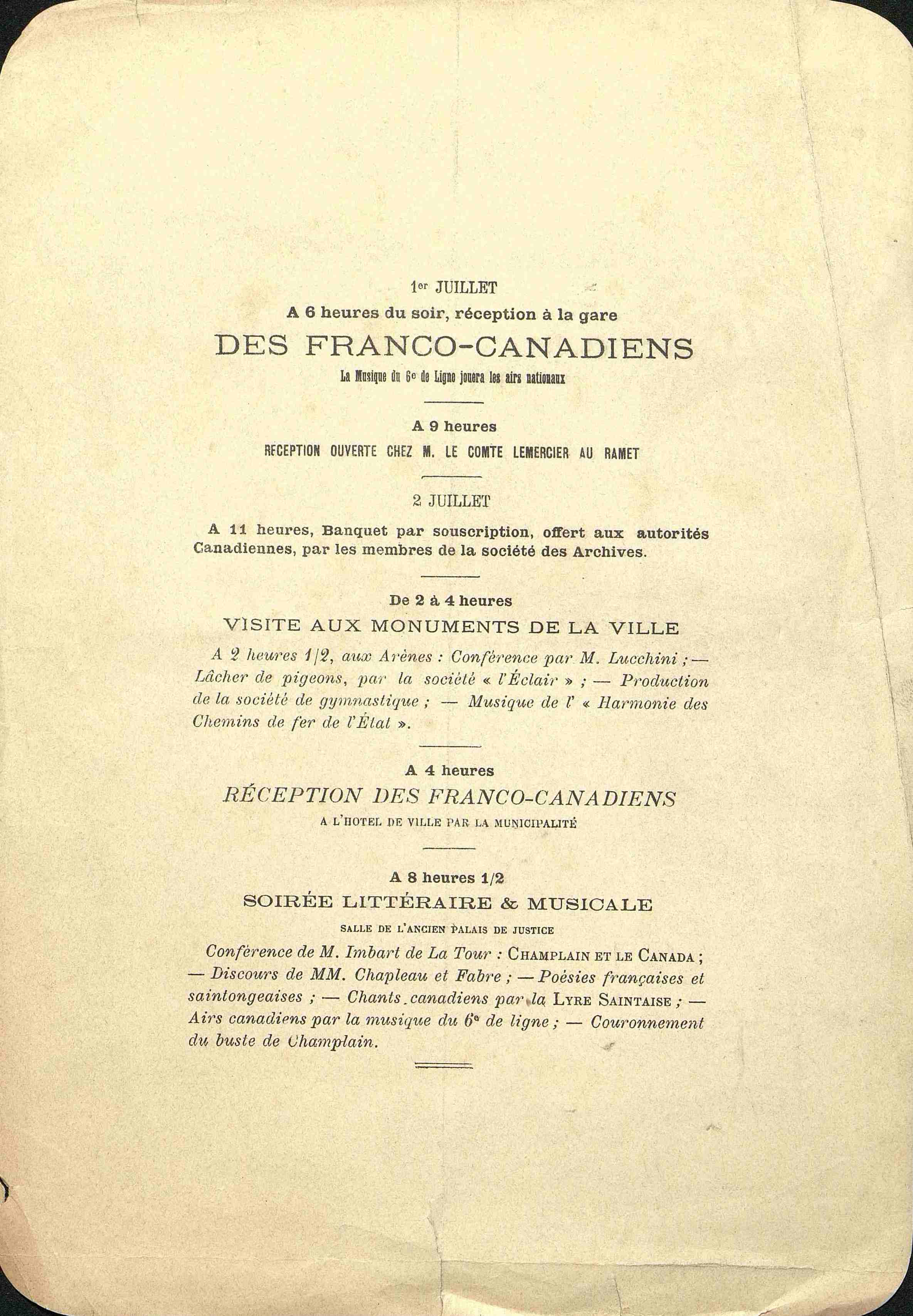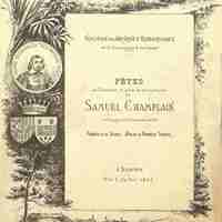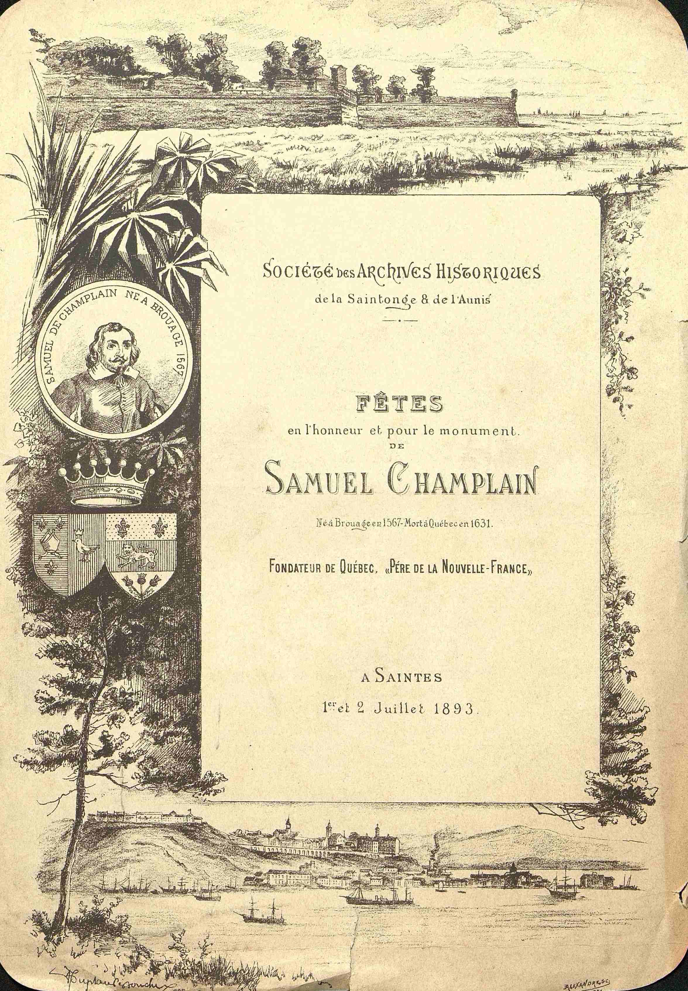 Fêtes en l'honneur et pour le monument de Samuel Champlain organisée par la Société des Archives Historiques de Saintonge et de l'Aunis. Illustré et daté.