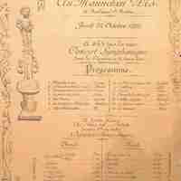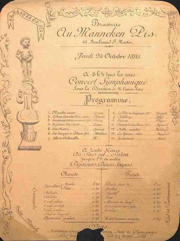 Programme publicitaire pour une brasserie non-localisée qui propose aussi un concert pour le jeudi 24 octobre 1895. Document altéré.