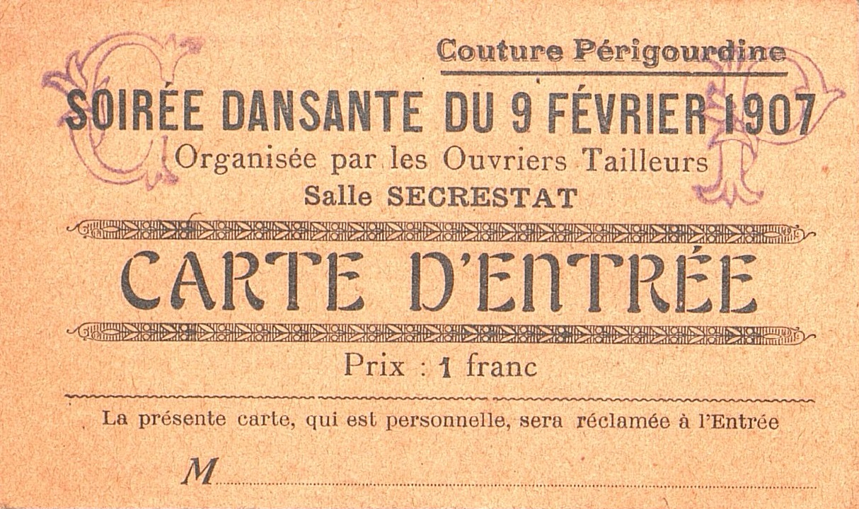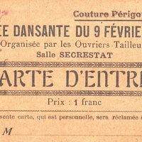 Carte d'entrée vierge pour la soirée dansante organisée par les Ouvriers Tailleurs Salle Sécrestat.
