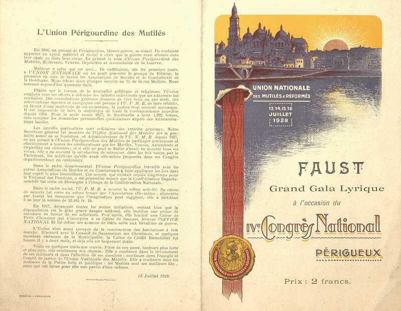 Programme détaillé du Grand Gala Lyrique Faust par le Chœur de Bergerac. IVe Congrès National de l'Union des Mutilés et Réformés, à Périgueux.