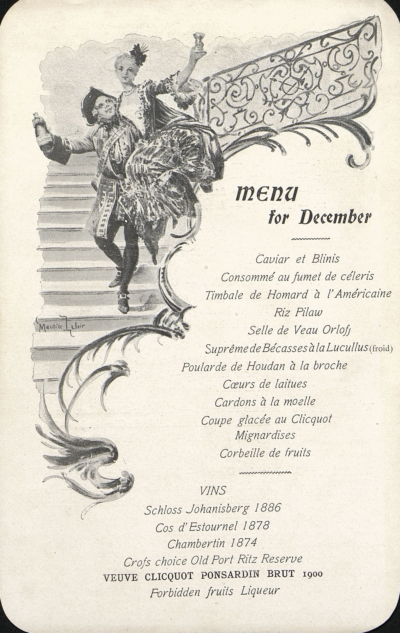 Vins : Schloss Johanisberg 1886, Cos d'Estournel 1878, Chambertin 1874, Crofs choice Old Port Ritz Reserve, Veuve Clicquot Ponsardin Brut 1900, Forbidden fruits Liqueur.