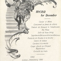 Caviar et Blinis ; Consommé au fumet de Céleris ; Timbale de Homard à l'Américaine ; Riz Pilaw ; Selle de Veau Orloff ; Suprême de Bécasses à la Lucullus (froid) ; Poularde de Houdan à la Broche ; Cœurs de laitues ; Cardons à la Moëlle ; Coupe glacée au Clicquot ; Mignardises ; Corbeille de fruits.