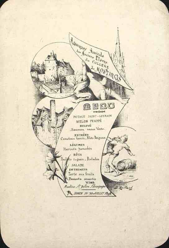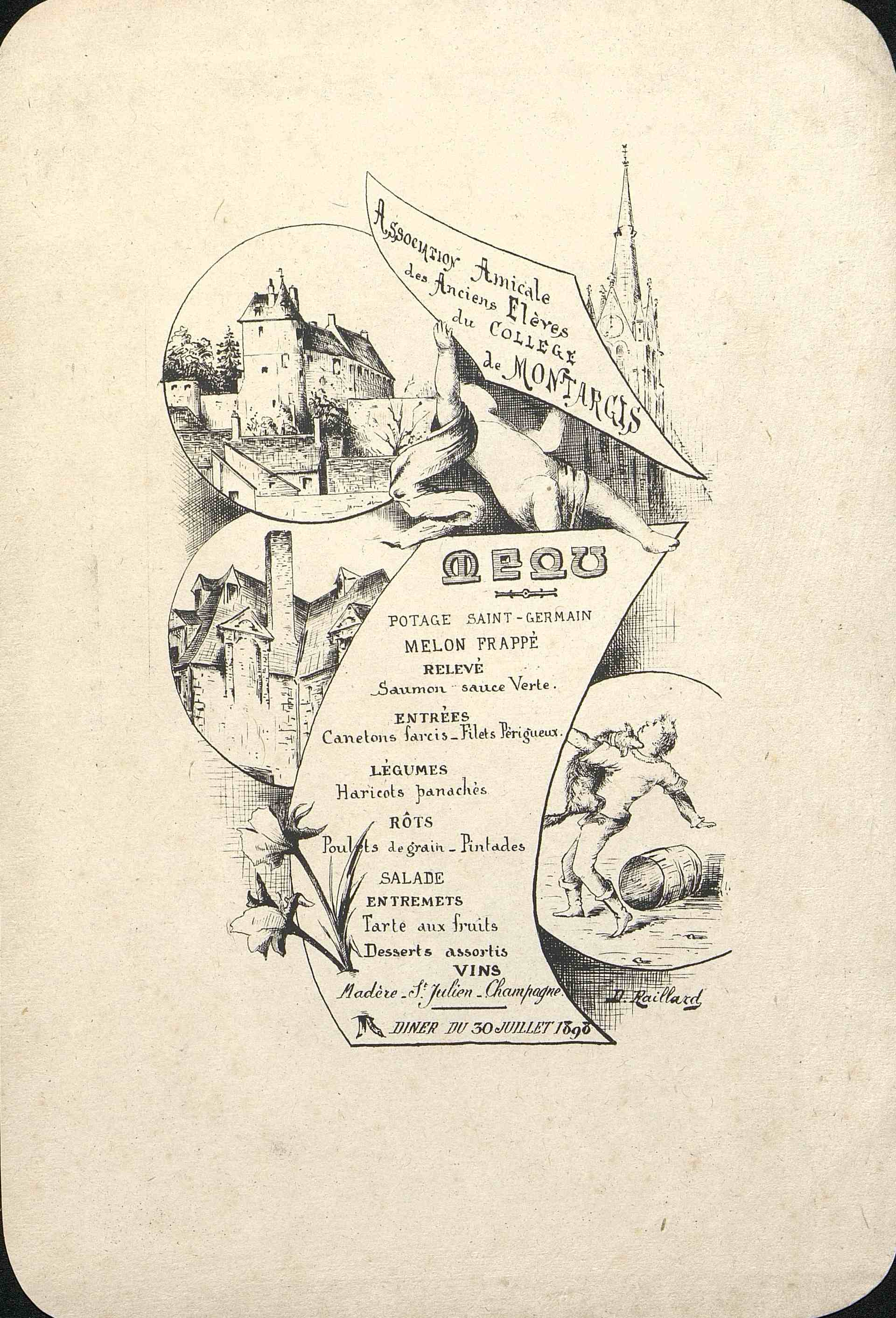 Menu relatif à l'Association Amicale des Anciens Elèves de Montargis. Illustré et daté du 30 Juillet 1898.