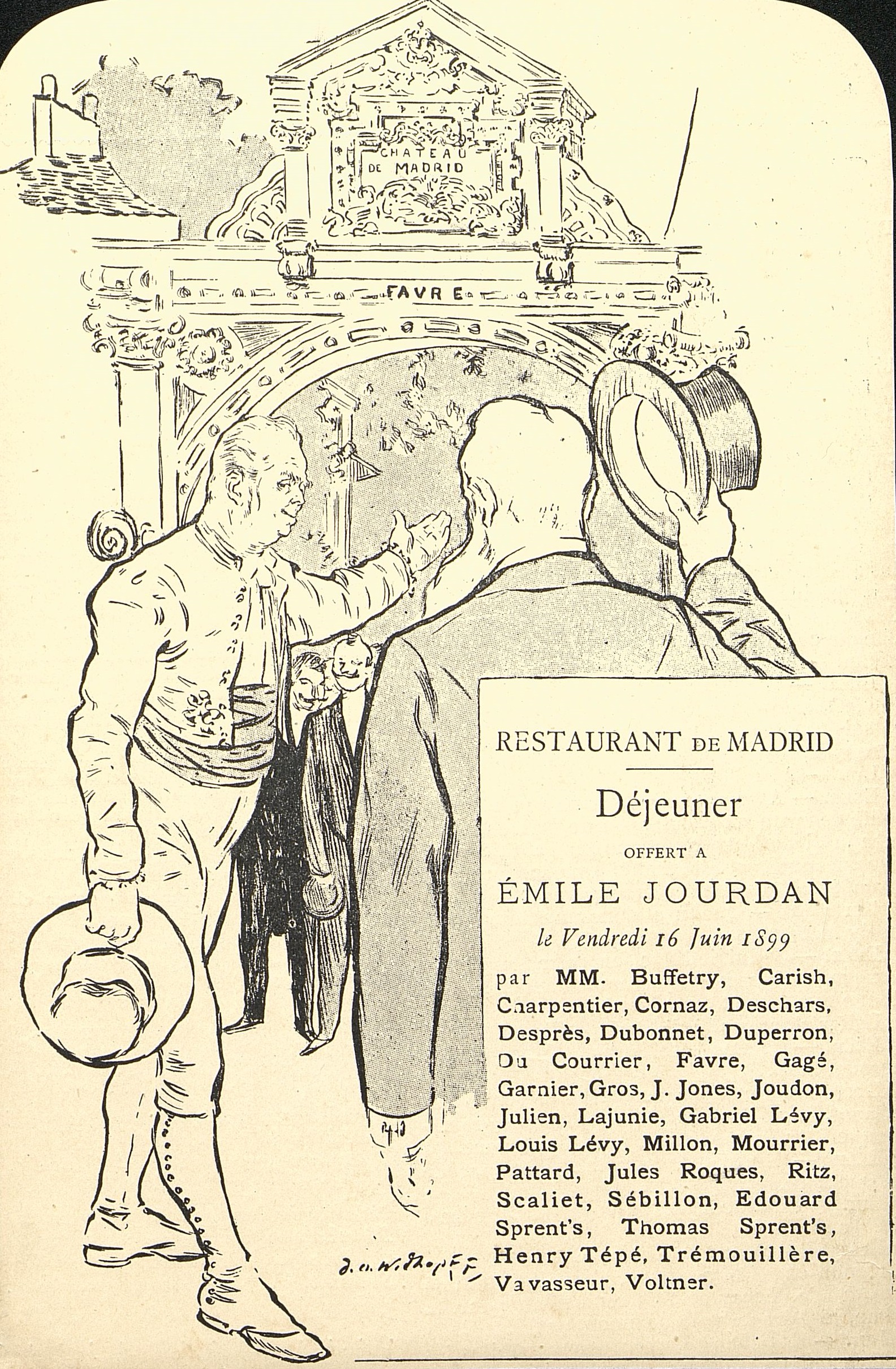 Liste des membres pour un repas offert à Emile Jourdan au Restaurant de Madrid.