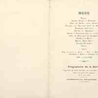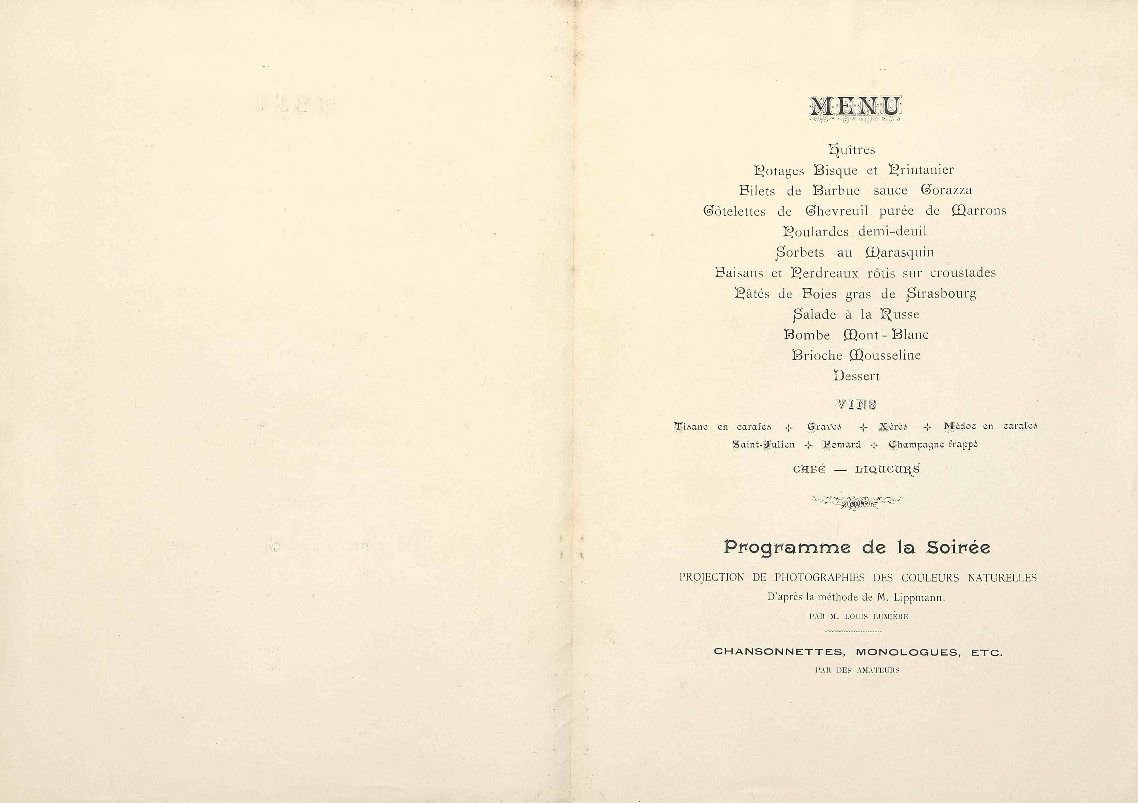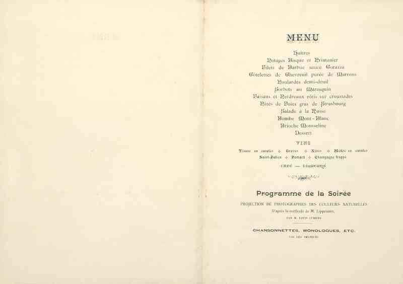Huitres ; Potages Bisque et Printanier ; Filet de Barbue sauce Corazza ; Côtelettes de Chevreuil purée de Marrons ; Poulardes demi-deuil ; Sorbet au Marasquin ; Faisans et Perdreaux rôtis sur Croustades ; Pâtés de Foies gras de Strasbourg ; Salade à la Russe ; Bombe Mont-Blanc ; Brioche Mousseline ; Dessert.