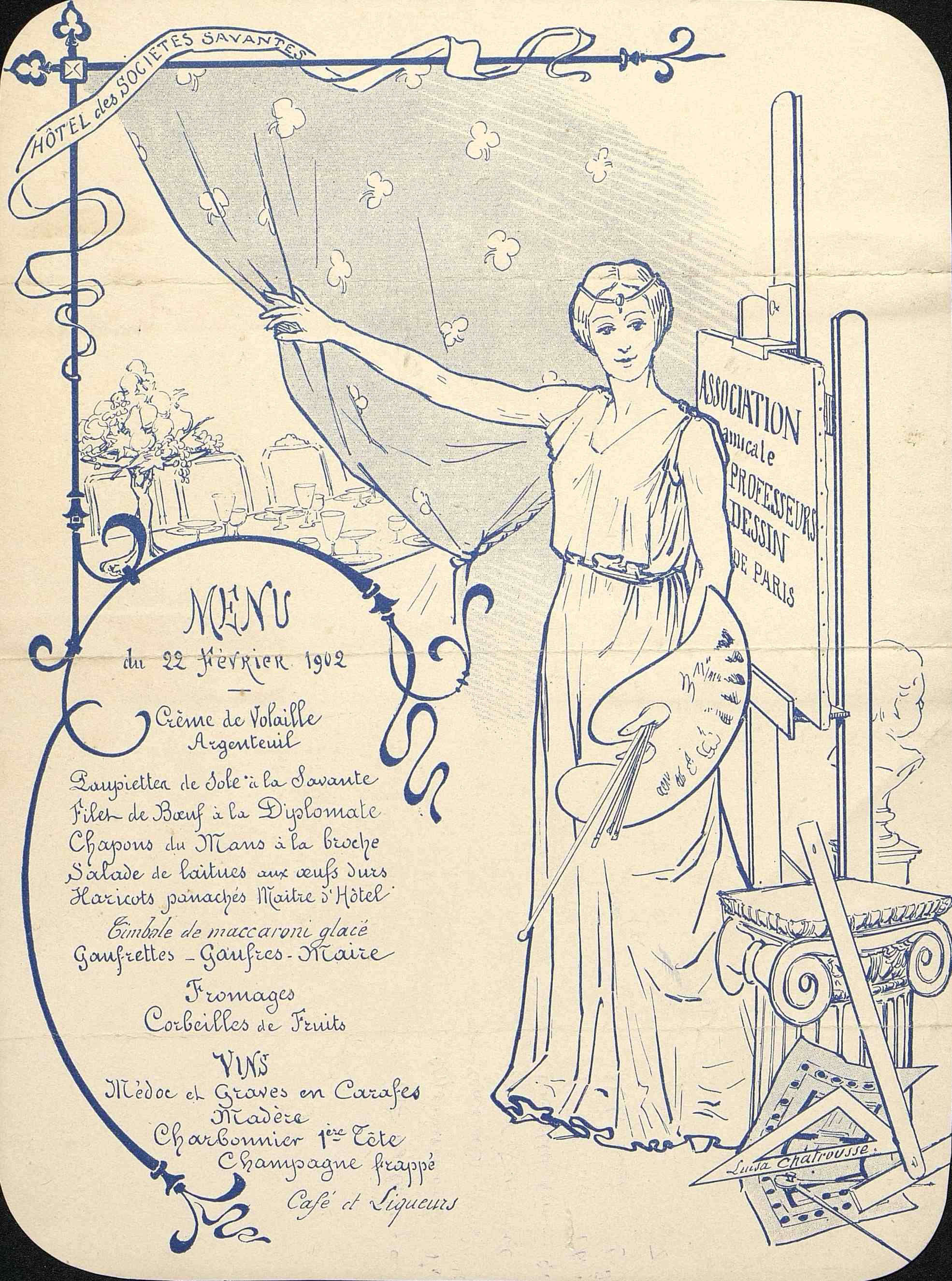 Menu de l'Association amicale des Professeurs de Dessin de Paris, tenu à l'Hôtel des Sociétés Savantes le 22 février 1902.