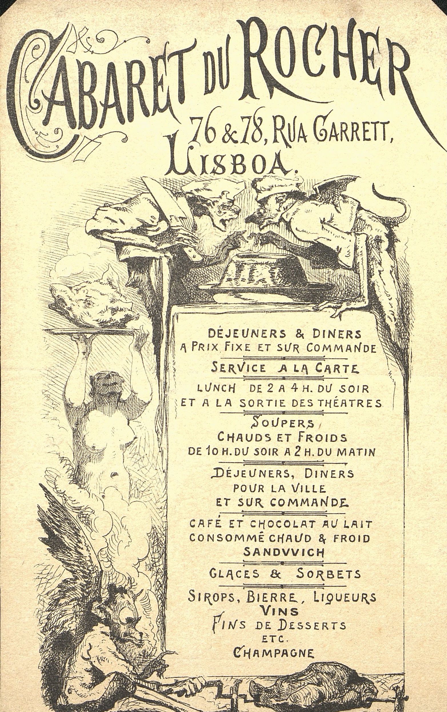 Affichette illustrée de présentation du Cabaret du Rocher à Lisbonne.