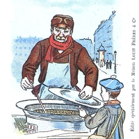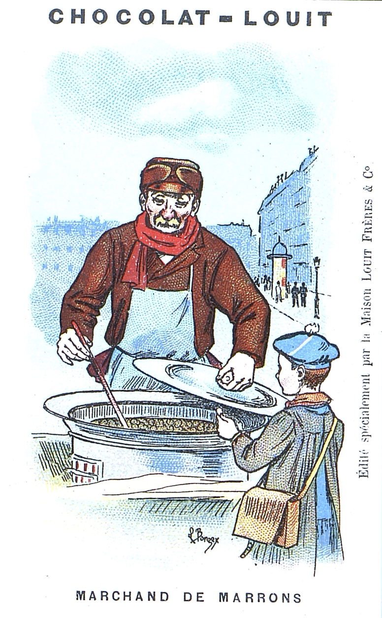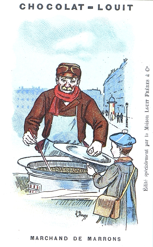 Carte publicitaire du Chocolat-Louit avec le Le marchand de marrons en illustration.