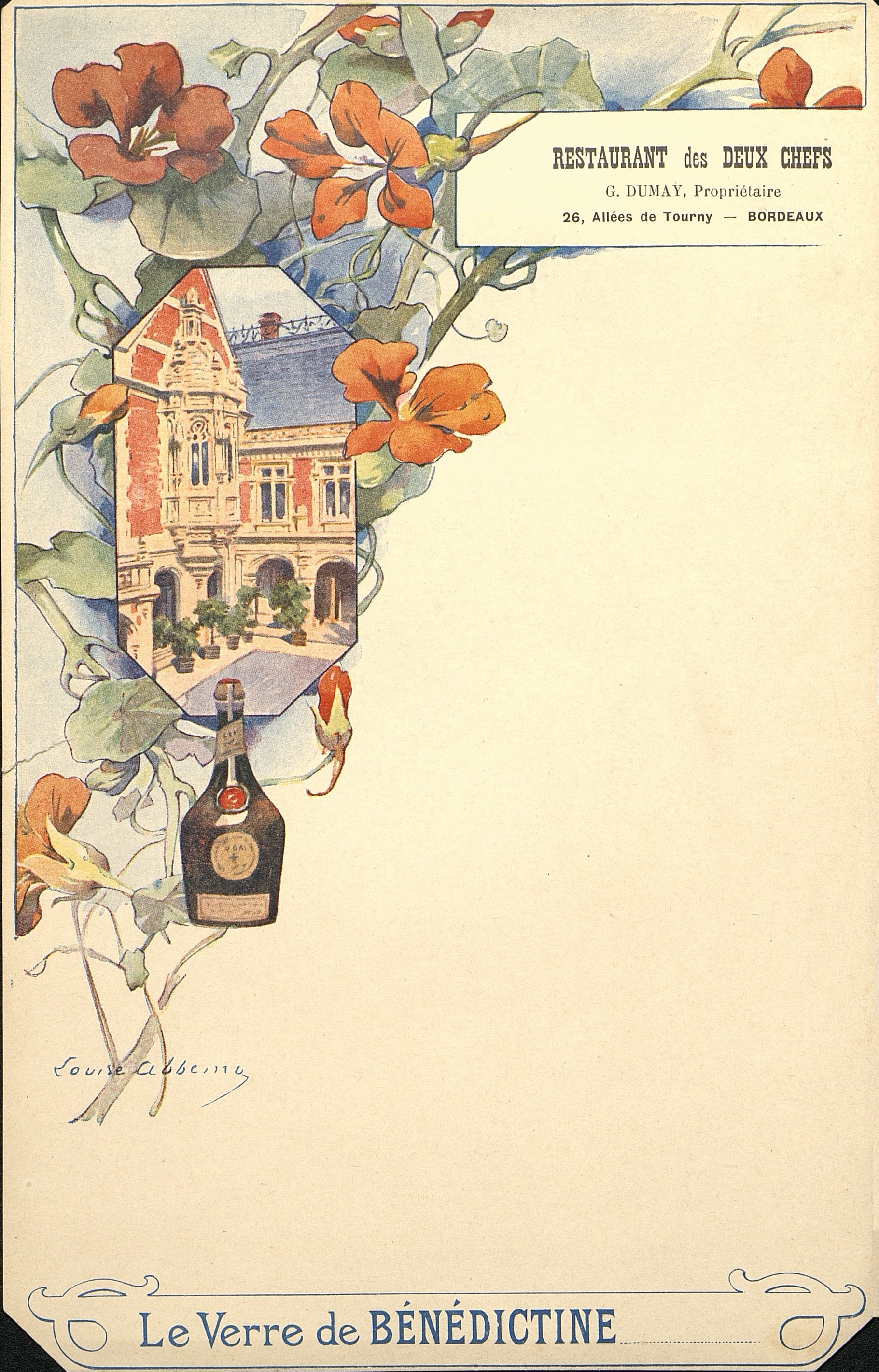 Menu vierge publicitaire : La Bénédictine du Restaurant les Deux Chefs à Bordeaux.