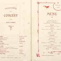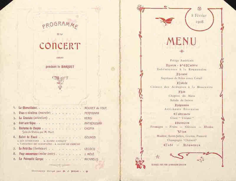 Plats servis : Potage Américain. Hors-d'Oeuvre : Bohémiennes à la Rouennaise. Relevé : Suprêmes de Soles sauce Corail. Entrée : Cuissot des Ardennes à la Moscovite. Rôt : Chapons du Mans. Salade de Saison. Légumes : Artichauts Béarnaise. Entremets : Glace "Viviane". Desserts : Fromages, Fruits. Gâteaux. Rhodos.