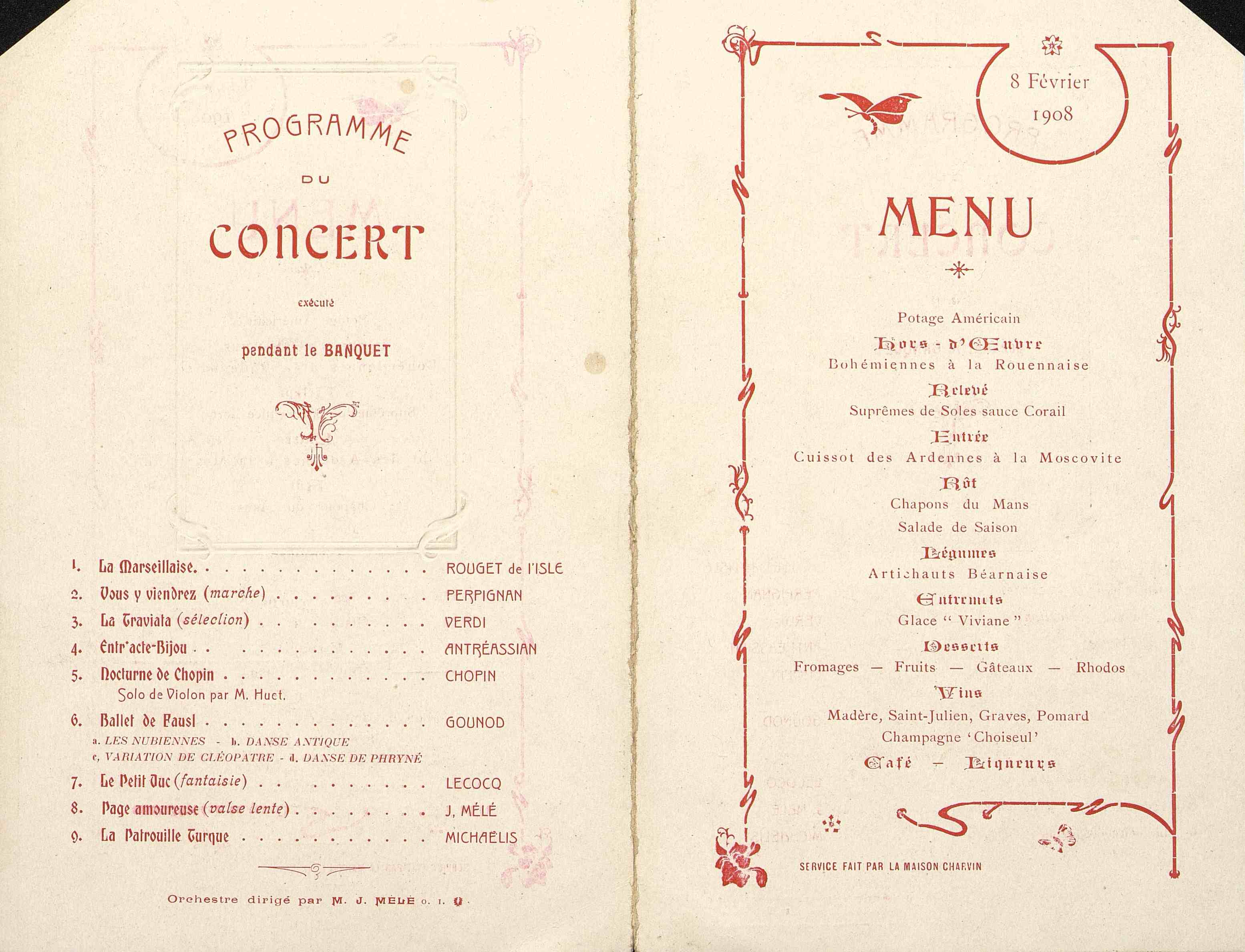 Musiques : La Marseillaise, Vous y viendrez, La Traviata, Entr'acte Bijou, Nocturne de Chopin, Ballet de Faust, Le Petit Duc, Page amoureuse, La patrouille Turque.
