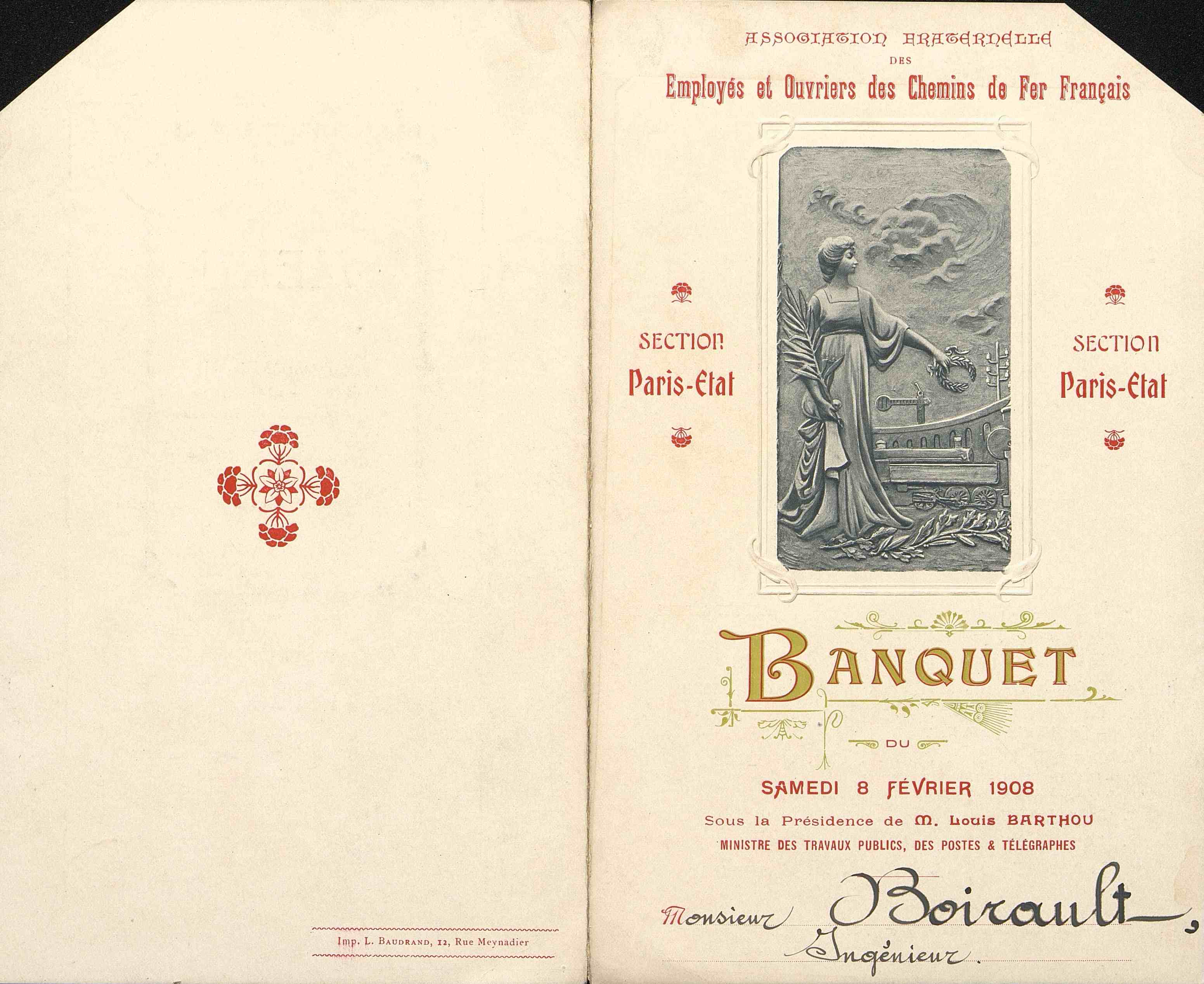 Menu de l'Association fraternelle des Employés et Ouvriers du Chemin de Fer français dédié à M. Boirault.