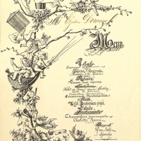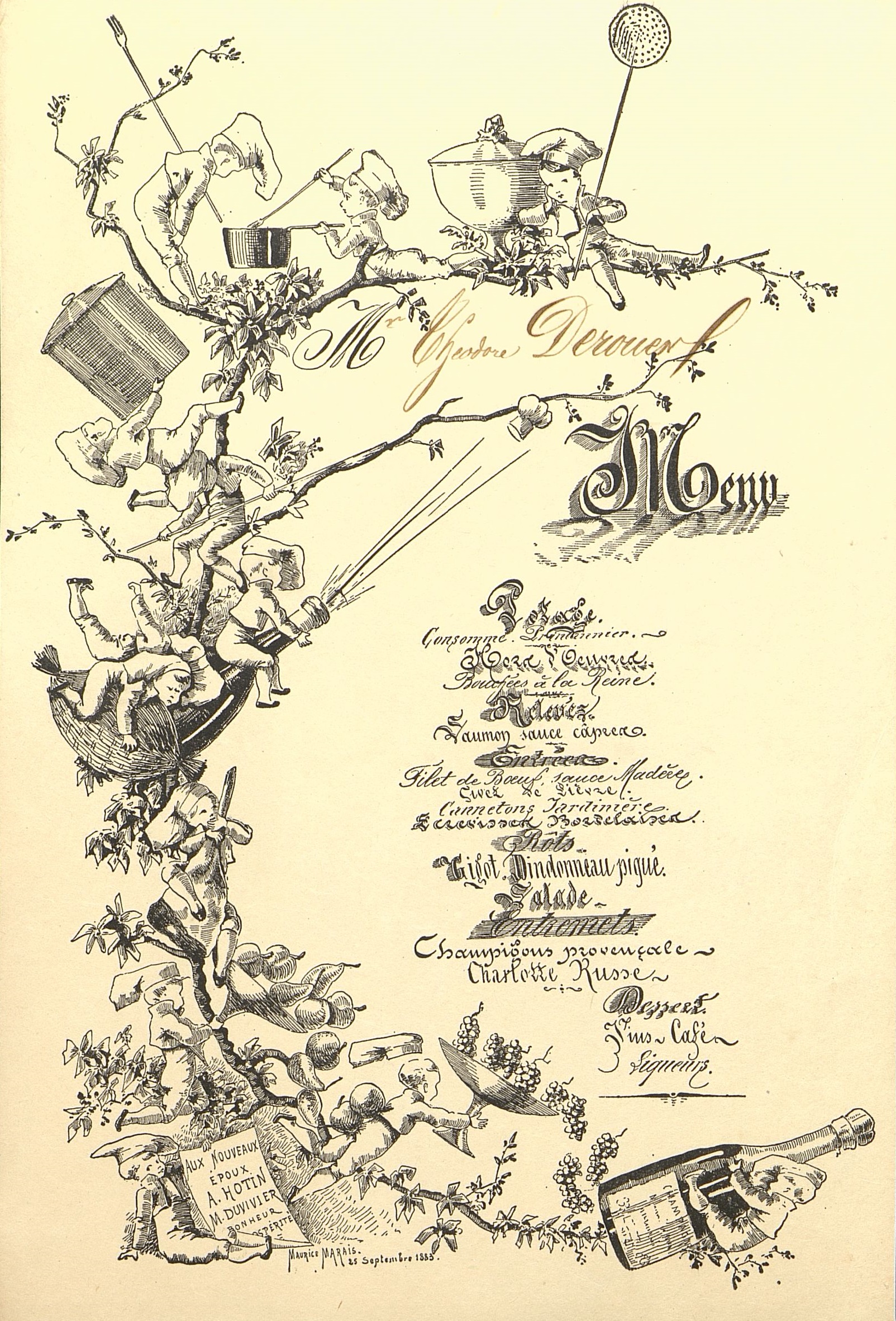 Potage consommé et Printanier ; Hors d’œuvre ; Bouchées à la Reine ; Saumon sauce câpres ; Filet de bœuf sauce Madère ; Civet de Lièvre ; Cannetons Jardinière ; Ecrevisses Bordelaises ; Gigot Dindonneau piqué ; Salade ; Champignons provençale ; Charlotte russe ; Dessert. Vins, café et Liqueurs.