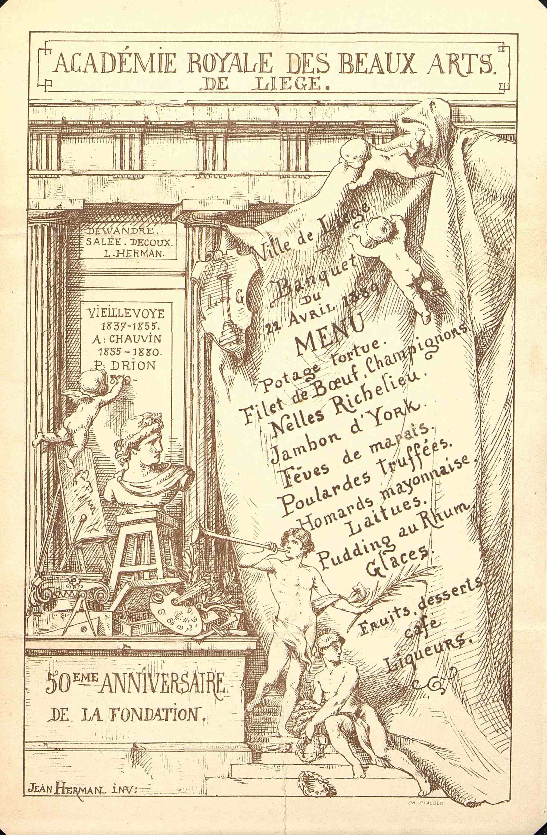 Menu de Académie Royale des Beaux-Arts de Liège daté du 22 avril 1889.