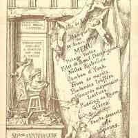 Potage tortue ; Filet de Bœuf Champignons ; Nelles Richelieu ; Jambon d'York ; Fèves de Marais ; Poulardes truffées ; Homards mayonnaise ; Laitues ; Pudding au Rhum ; Glaces ; Fruits, Desserts, Café, Liqueurs.