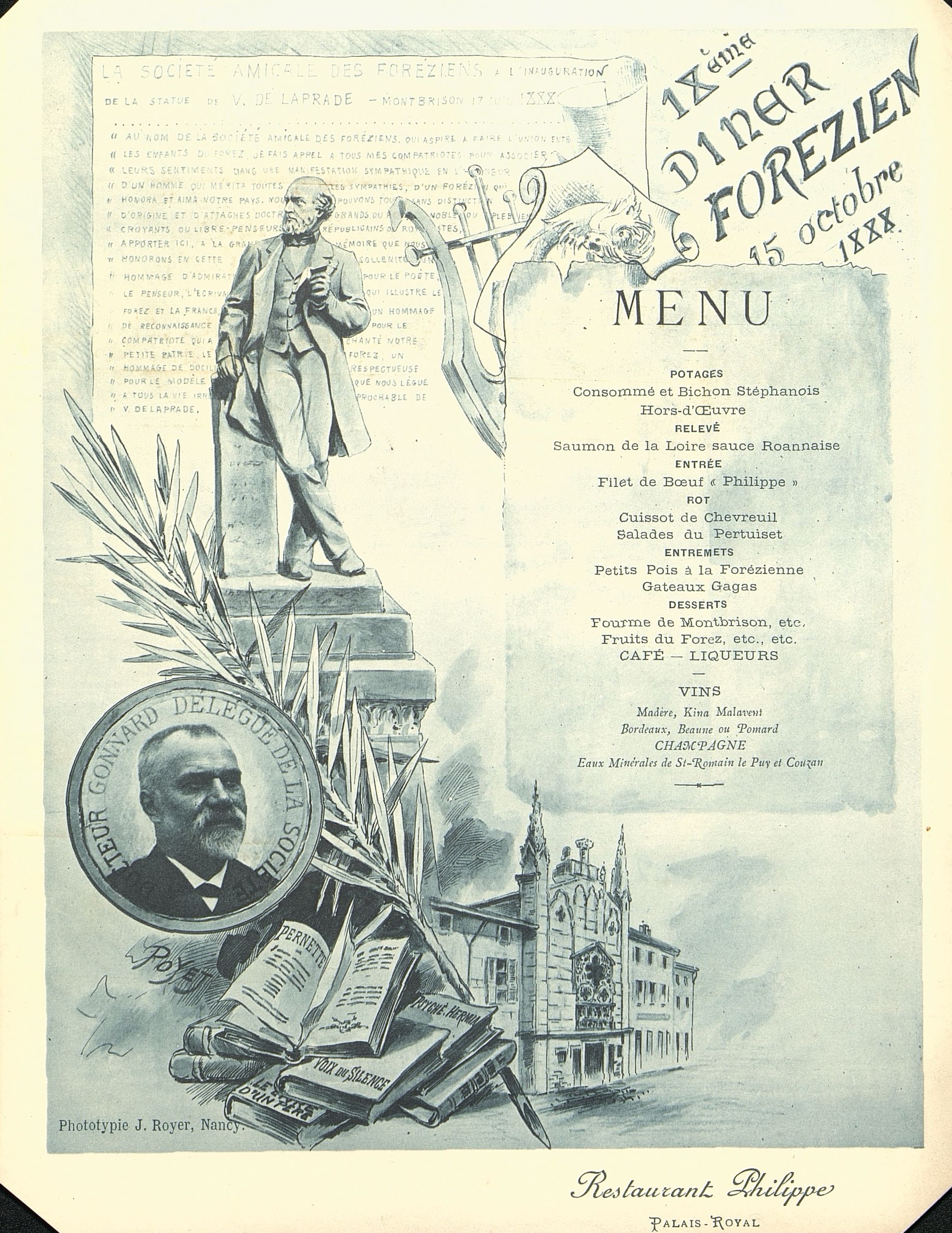 Plats servis : Potage : Consommé et Bichon Stéphanois. Hors d’œuvre. Relevé : Saumon de la Loire sauce Roannaise. Entrée : Filet de bœuf "Philippe". Rôt : Cuissot de Chevreuil. Salade du Pertuiset. Entremets : Petits Pois à la Forézienne. Gâteaux Gagas. Dessert : Fourme de Montbrison. Fruits du Forez .