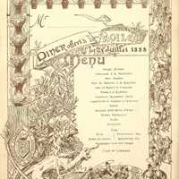 Dîner offert à Luc Boileau le 25 juillet 1888 pour la remise de la Légion d'honneur. Menu non attribué. Armoiries "Ecu droit au lion lampassé couronné ? ". Encadrement : pilastre gauche surmonté des attributs de la République Française est décoré d'un défilé de service de chefs de rang portant les plats du banquet vus de dos, suivi en en-tête de la table des convives surmontée de la décoration de la Légion d'honneur, suivi du pilastre de même illustré de la sortie débandade des convives du banquet. A dextre du menu, devant un olivier, un lion chef cuisinier à bésicles et toque écrit le menu à la plume d'oie devant un lapin vivant sortant d'une casserole.