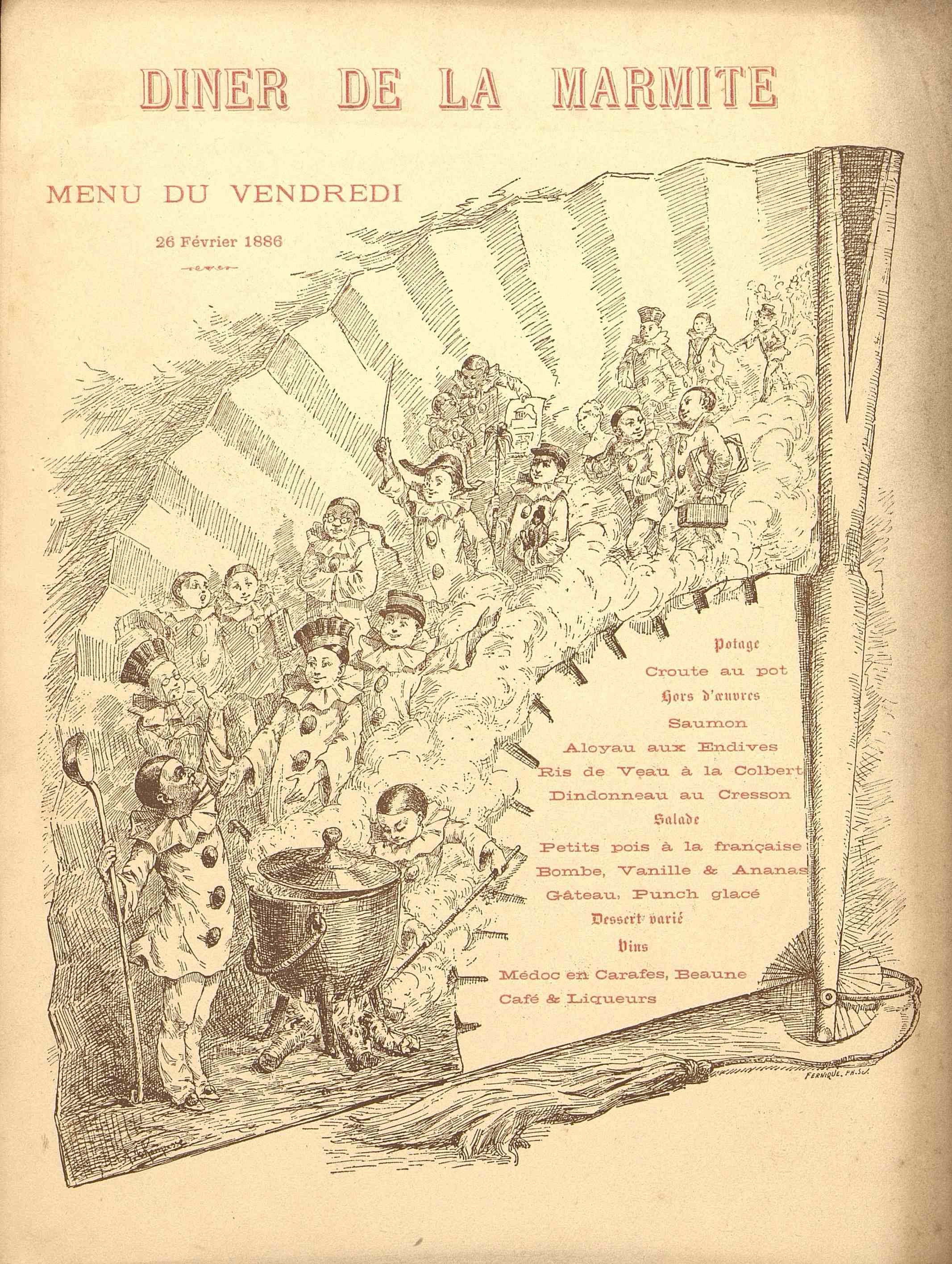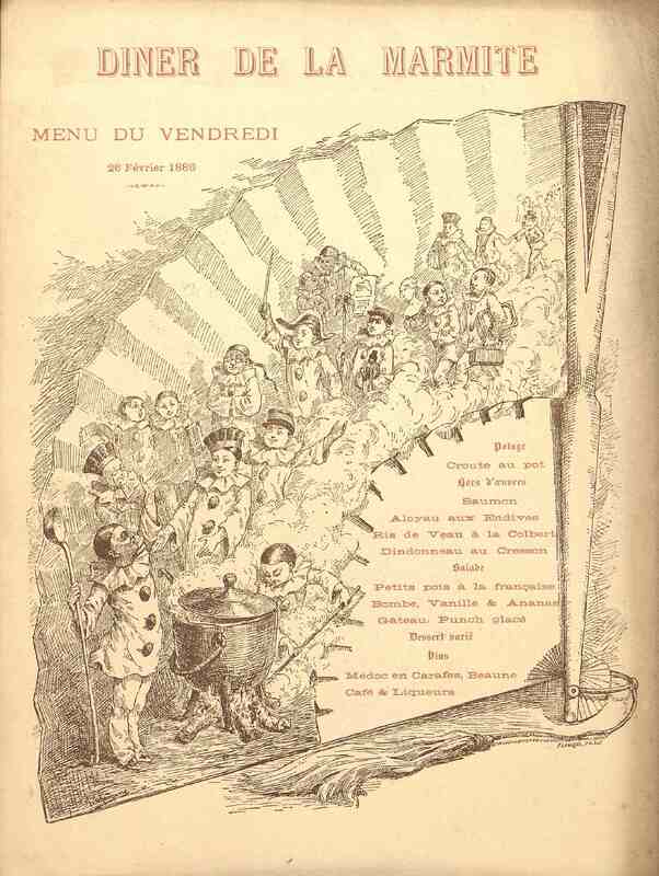 Plats servis : Croute au pot. Hors d’œuvres. Saumon. Aloyau aux Endives. Ris de Veau à la Colbert. Dindonneau au Cresson. Salade. Petits pois à la française. Bombe,Vanille et Ananas. Gâteau. Punch glacé. Dessert varié.