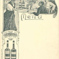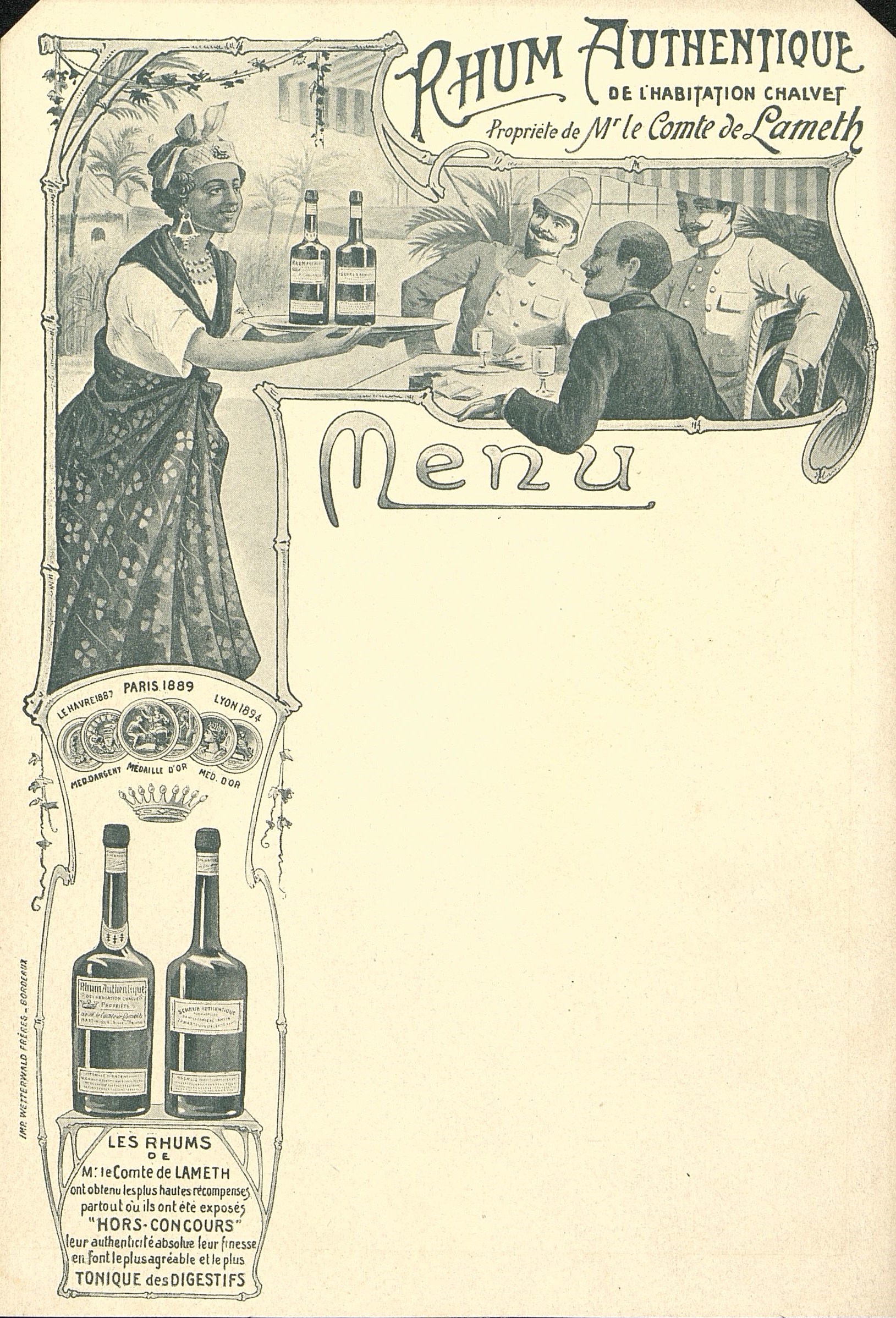 Menu vierge publicitaire : Rhum authentique. Illustration commerciale un antillaise servant sur un plateau une bouteille de Rhum authentique et une bouteille de Schrub de la Maison Chalvet à trois officiers coloniaux sous un vélum. Médailles des expositions : d'argent pour Le Havre 1887, d'or pour Paris 1889, d'or pour Lyon 1994 Couronne comtale.