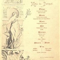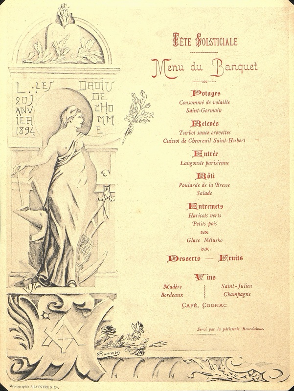 Menu du Banquet de la Fête Solsticiale. Illustration par une stèle antique en hommage aux droits de l'Homme le 20 janvier 1894 représentée par une déesse au sein dévoilée tenant un rameau d'olivier de la main gauche et une masse de la main droite sur l'enclume à ses pieds une araire, une gerbe de blé, une faux présentée sur un socle en chapiteau antique au décor parcheminé des rinceaux à senestre et des roses à dextre équerre et archipendule de maçon entrecroisés, le ciseau du tailleur au centre, un soleil . Signature de F Romain. Glyptographie de Sylvestre et Cie.