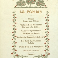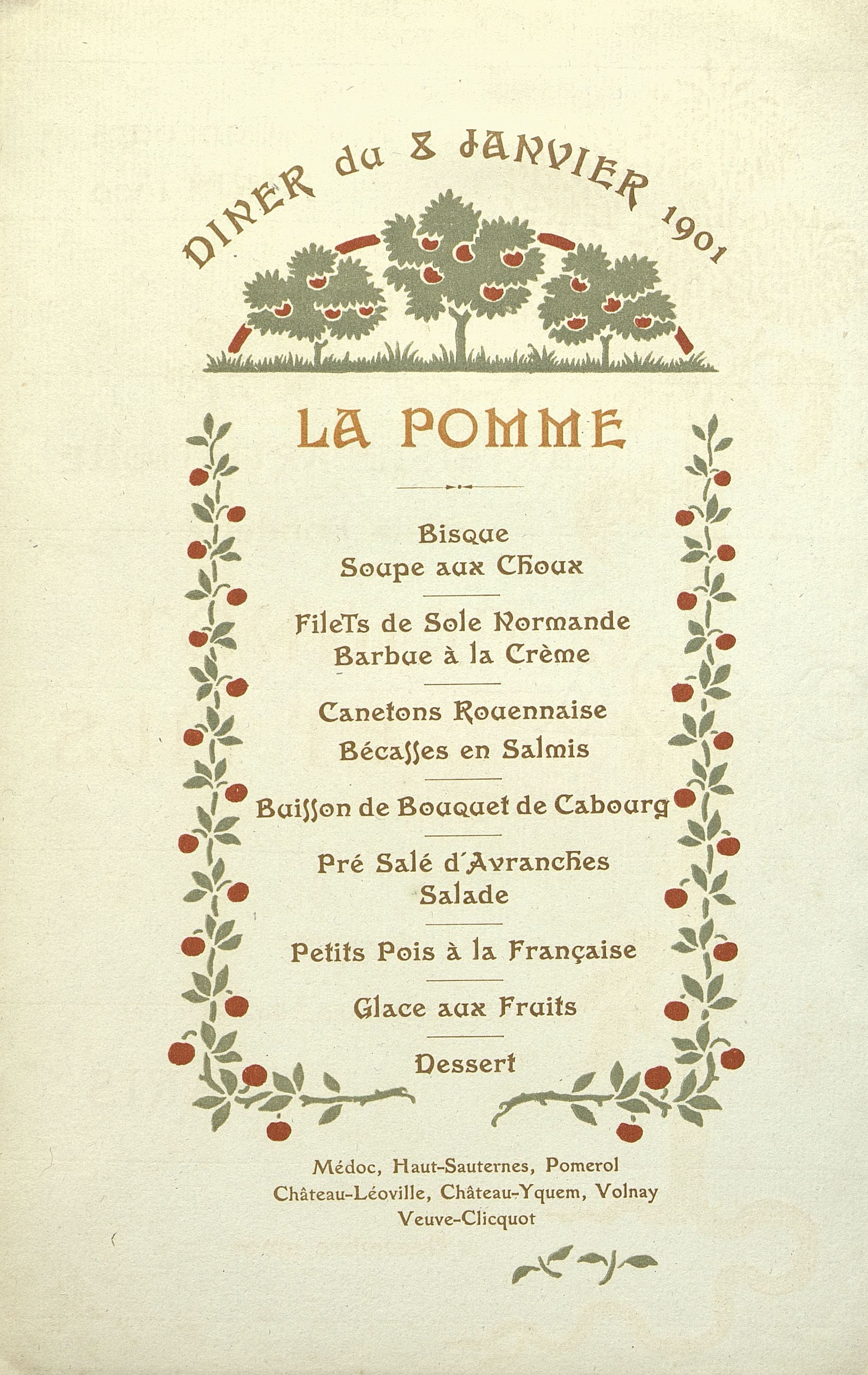 Dîner du 8 janvier 1901 de La Pomme. Illustration : Branches de pommiers portant des pommes rouges en guirlande-branche en marge surmontées de trois pommiers en couronnement.