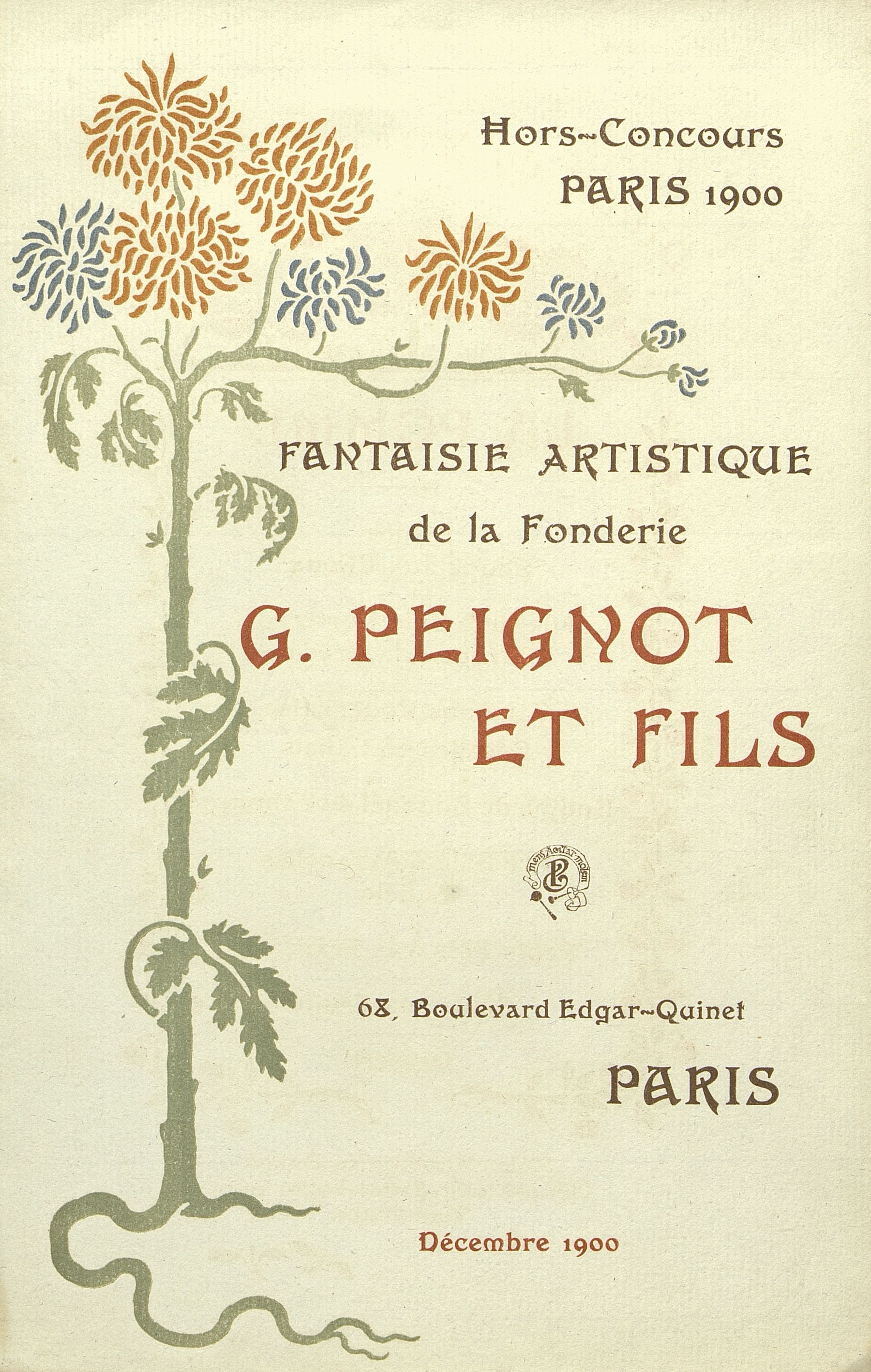 Au dos une publicité pour la fonderie G. Peignot et fils. Illustration en angle : pivoines bleues et mordorées. Hors-Concours Paris 1900. Poinçon avec devise en latin "Mens Agitat molem" = "l'esprit meut la matière" entoure les initiales de Georges Peignot avec gouge et maillet de typographe-Imprimeur.