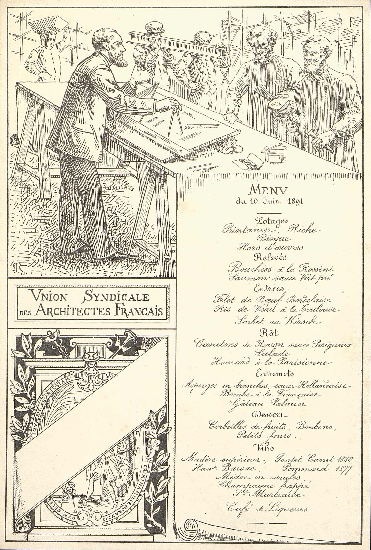 Menu de l'Union Syndicale des Architectes français. Illustré d'un dessin représentant un architecte distribuant les tâches à des ouvriers sur un chantier de restauration. JP R [Revellat ?]illustrateur. Devise : "Qvaerit ab Arte Viam...crimina mille Morantur Dum Celer..."