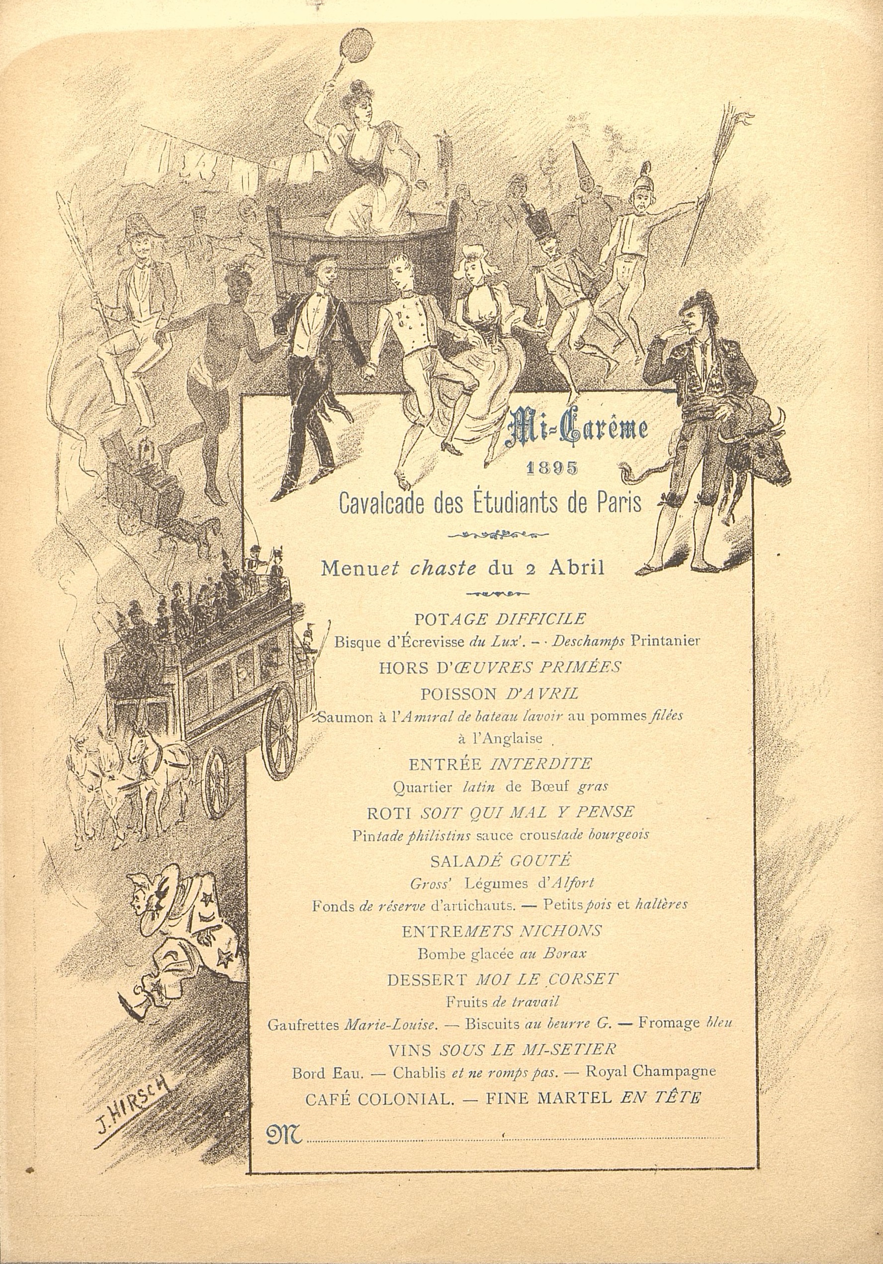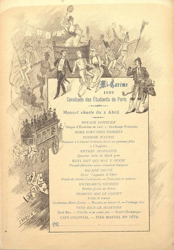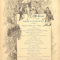 Menu illustré et traité avec humour de la Cavalcade des Etudiants de Paris en 1895.