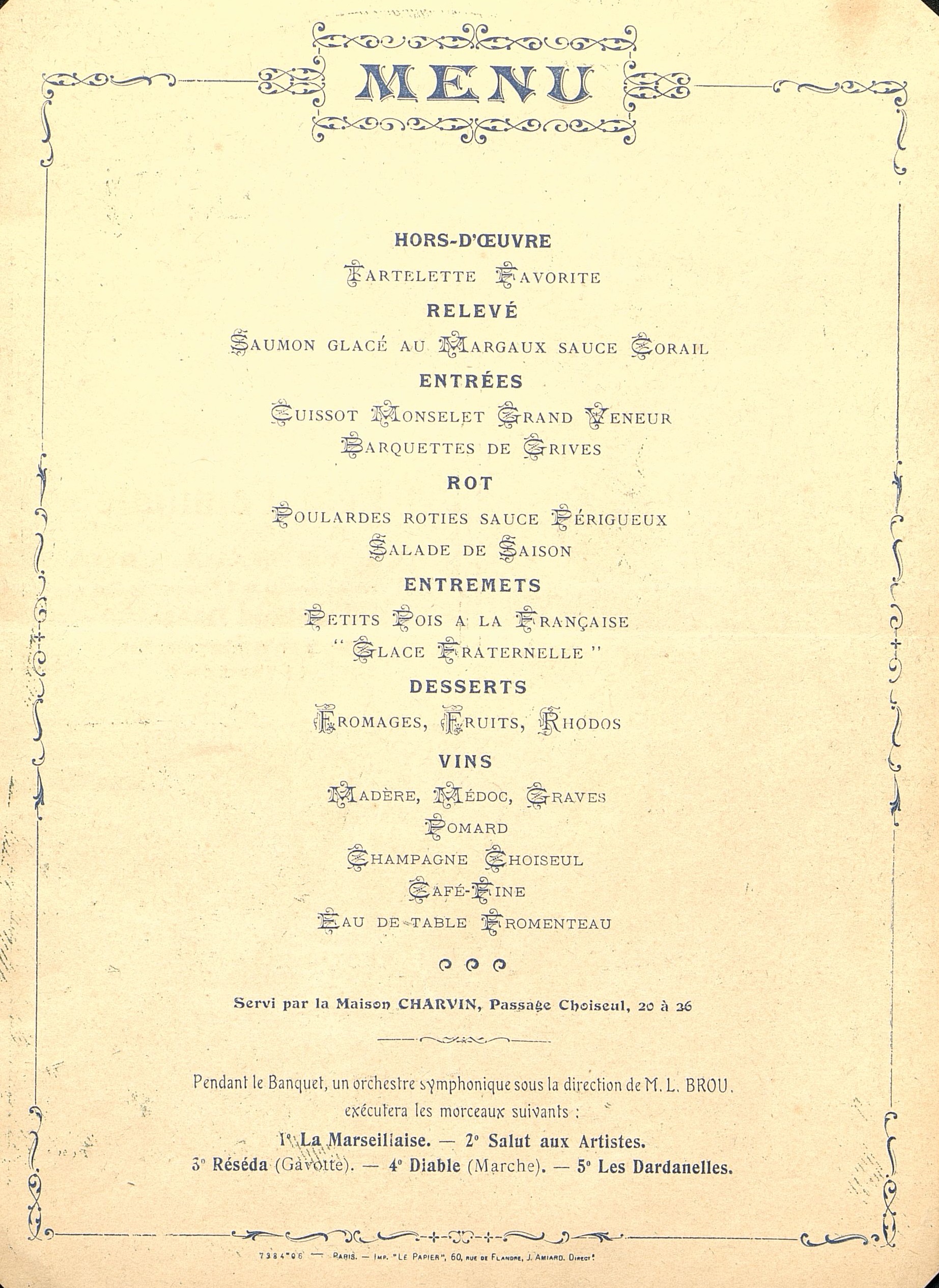 Plats servis : Hors-d’œuvre : Tartelette Favorite. Relevé : Saumon Glacé aux Margaux sauce Corail. Entrées : Cuissot Monselet Grand Veneur. Barquettes de Grives. Rôt : Poulardes rôties sauce Périgueux. Salade de Saison. Entremets : Petits Pois à la Française. Glace Fraternelle. Desserts : Fromage. Fruits. Rhodos.