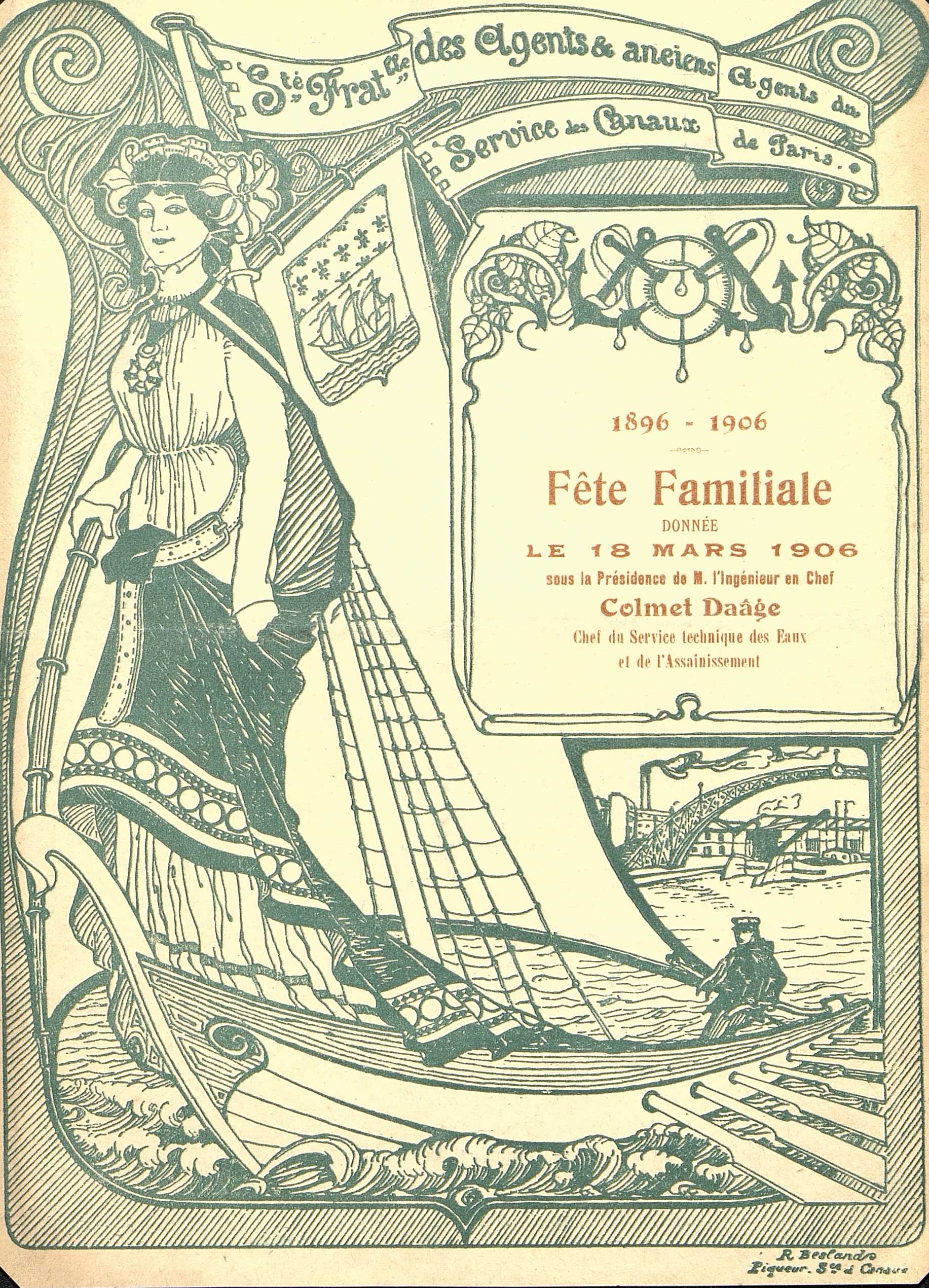 Menu de la Société Fraternelle des Agents et Anciens Agents du Service des Canaux de Paris. 1896-1906. Sous la présidence de M. l'Ingénieur en Chef Colmet Daâge. Illustration d'un voilier à rames sur le canal St-Martin en proue une jeune femme à la croix de la Légion d'Honneur tenant un mat aux armes de la ville de Paris.