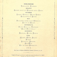 Boissons : Vins : Madère. Médoc. Graves. Pomard. Champagne Choiseul. Café-fine. Eau de table Fromenteau.